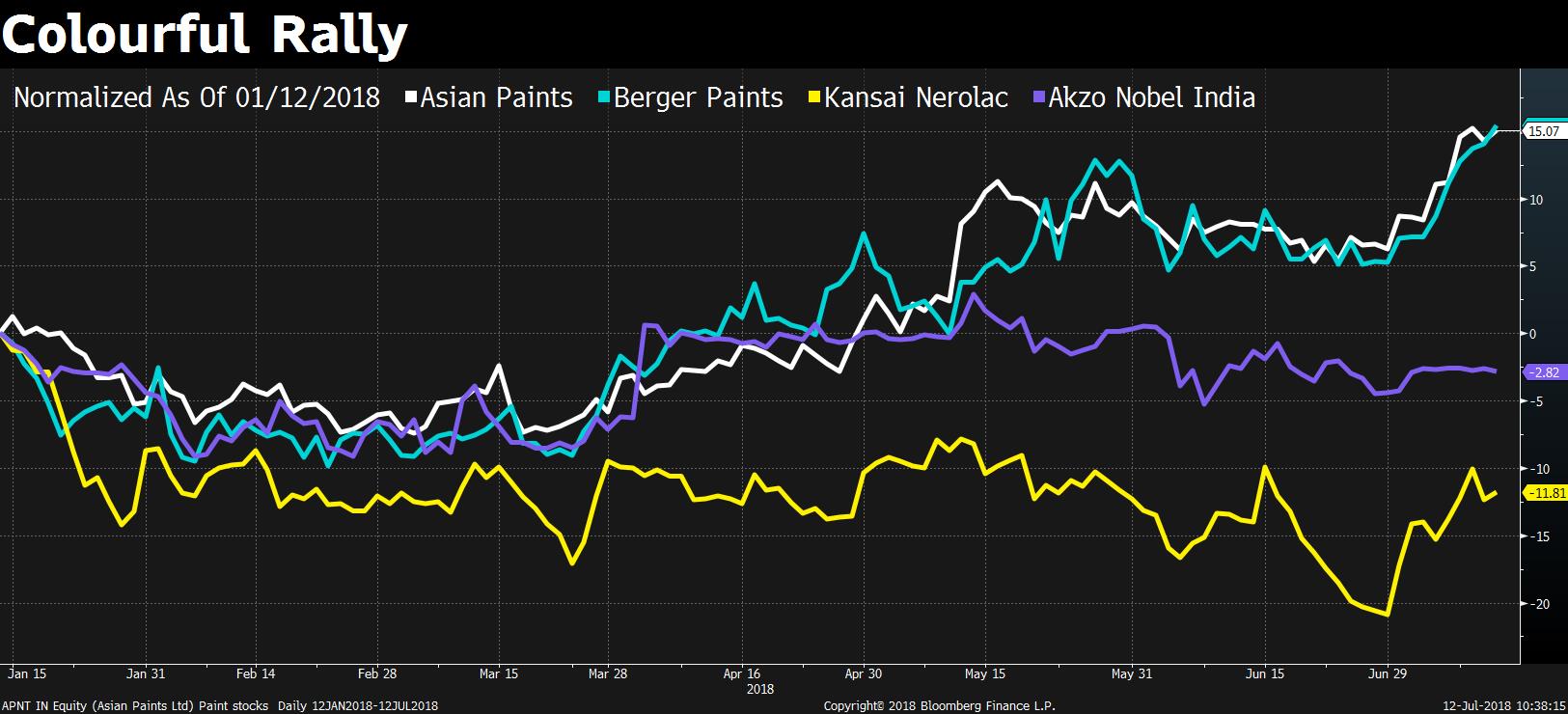 Kansai Nerolac Ltd. led the rally with a 11.7 percent jump in July, followed by Berger Paints Ltd. and Asian Paints Ltd.'s 9.3 percent and 7 percent rise, respectively.