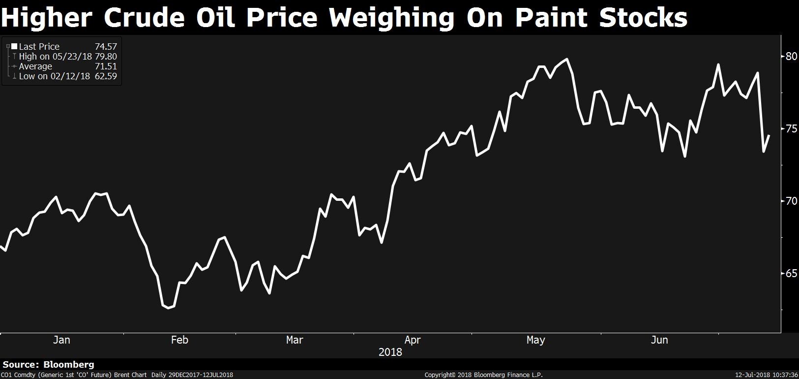 In May, Brent crude hit the $80 per barrel mark for the first time since November 2014. Prices of crude-related derivatives such as titanium dioxide and other monomers used in paints remain high. Titanium dioxide has become 10 percent costlier so far this year at Rs 265 a kilogram.