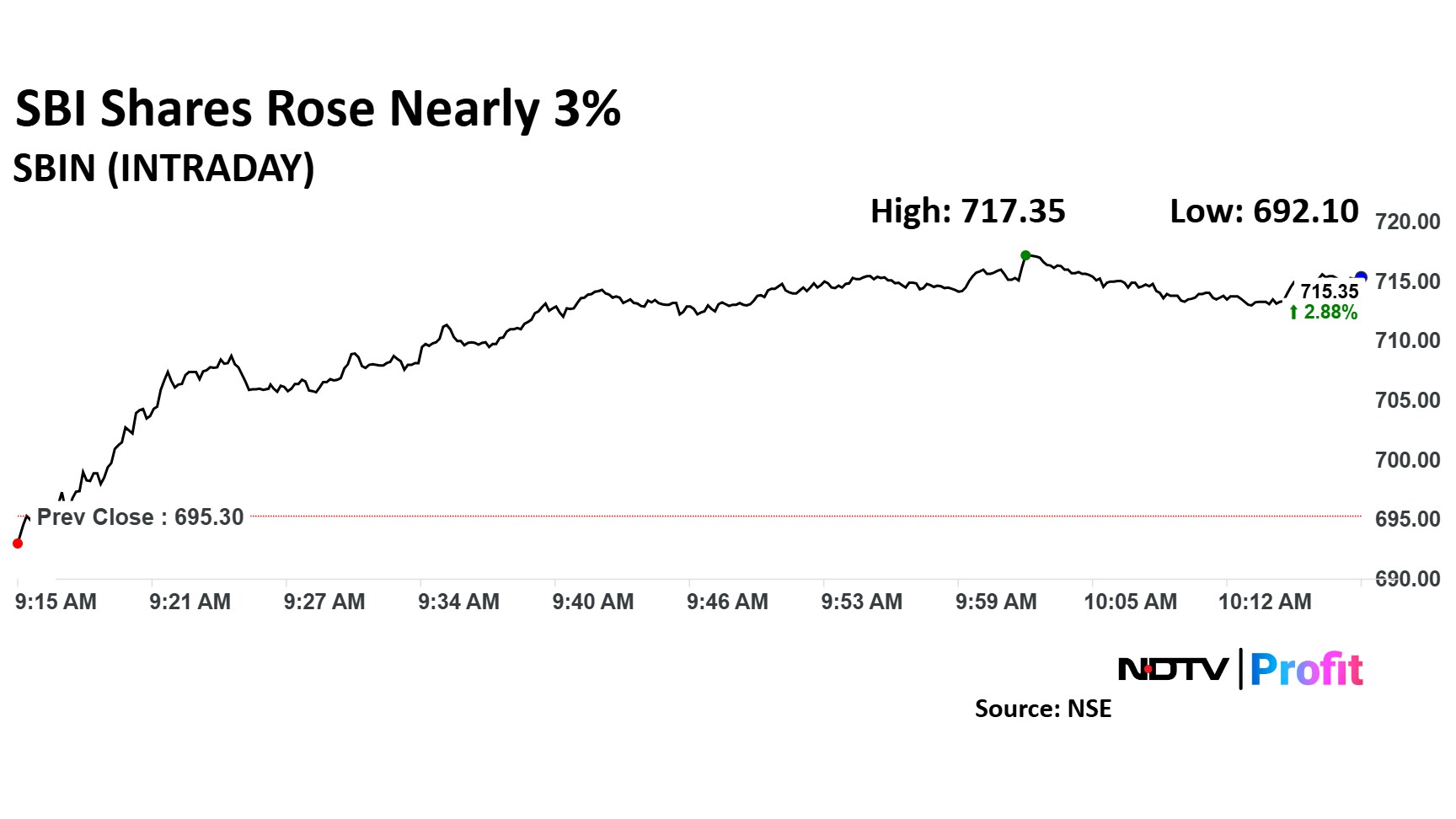 SBI shares rose as much as 3.17% during the day to Rs 717.3 apiece on the NSE. It was trading 2.62% higher at Rs 713.5 apiece, compared to a 0.25% decline in the benchmark Nifty 50 as of 10:18 a.m.