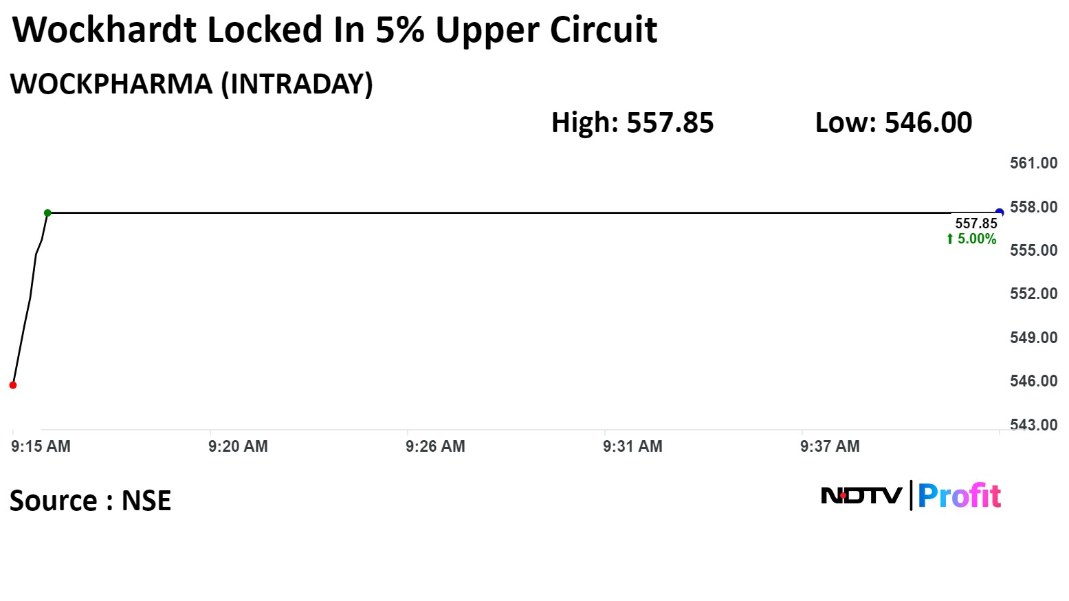 Shares of Wockhardt hit a 5% upper circuit at Rs 557.85 apiece, the highest level since March 21. It was locked in the 5% upper circuit as of 9:53 a.m. This compares to a 0.46% advance in the NSE Nifty 50 Index.