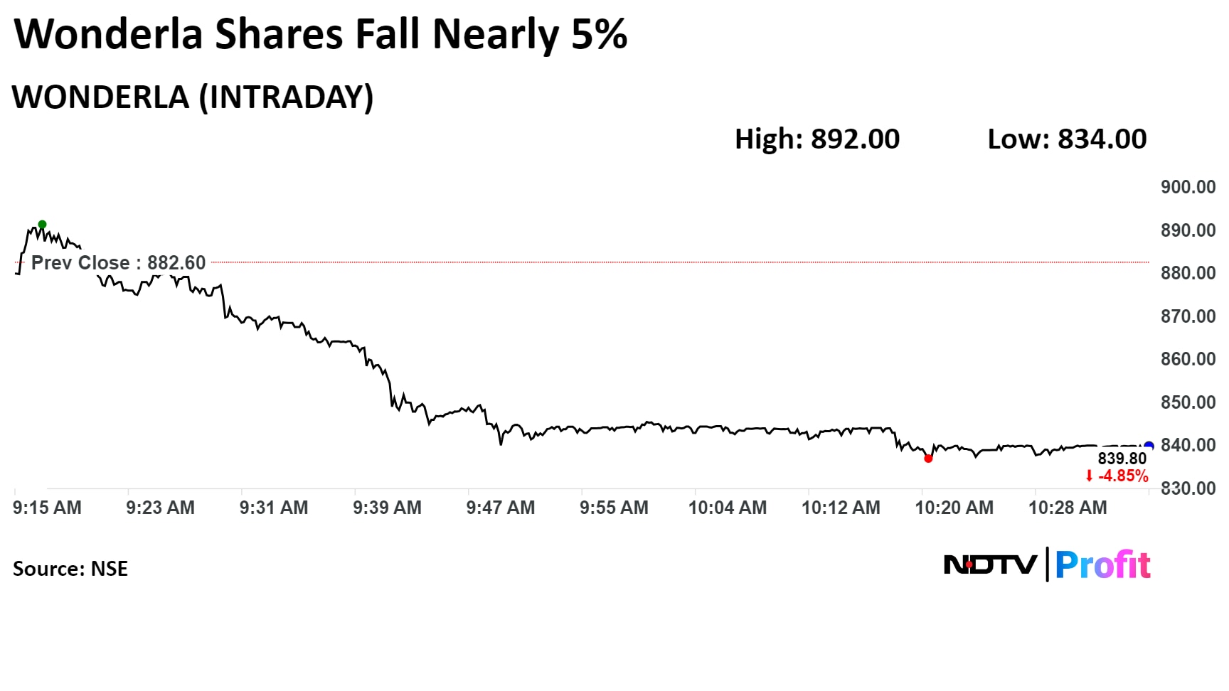 Shares of Wonderla Holidays fell as much as 5.51% to Rs 834 apiece, the most since July 29. It pared losses to trade 4.83% lower at Rs 840 apiece as of 10:53 a.m. This compares to a 0.28 advance in the NSE Nifty 50.