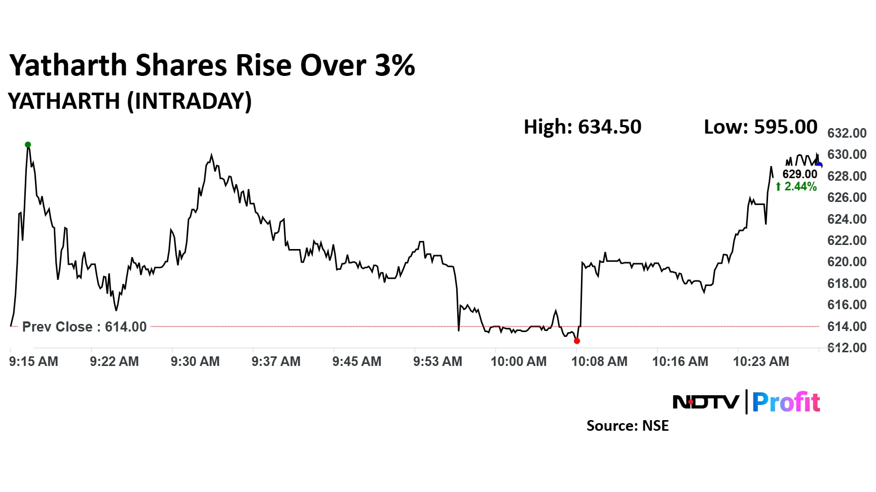 Yatharth Hospital's share price rose as much as 3.34% during the day to Rs 634.50 apiece on the NSE. It was trading 2.30% higher at Rs 638.15 apiece, compared to a 1.02% decline in the benchmark Nifty 50 as of 10:29 a.m.