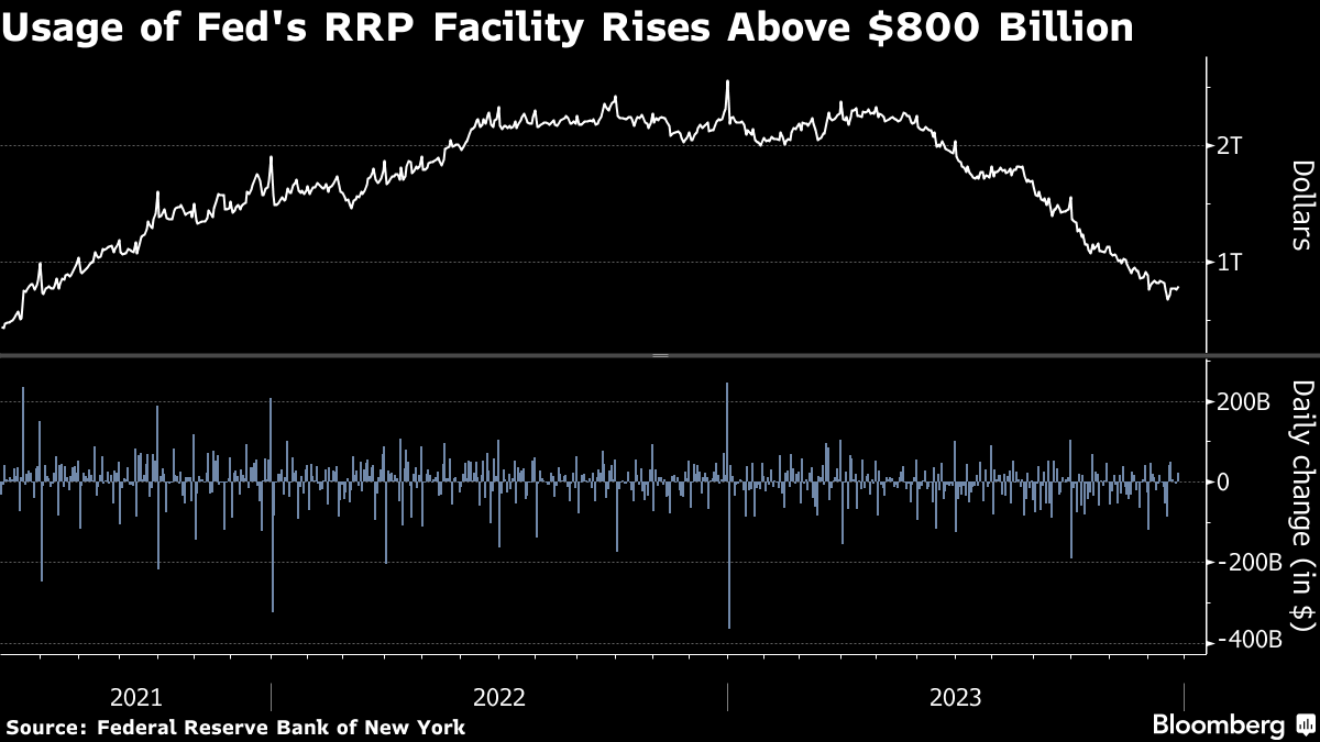 The Fed's reverse repo facility, or RRP, has been a place where counterparties — mostly money-market mutual funds — can park excess cash to earn a market rate, currently 5.3%. As banks pare their repo market activity to tidy up their balance sheets, it spurs money funds to shift more cash to the RRP. On Wednesday, 90 counterparties parked $819 billion at the facility, the most since Dec. 13.