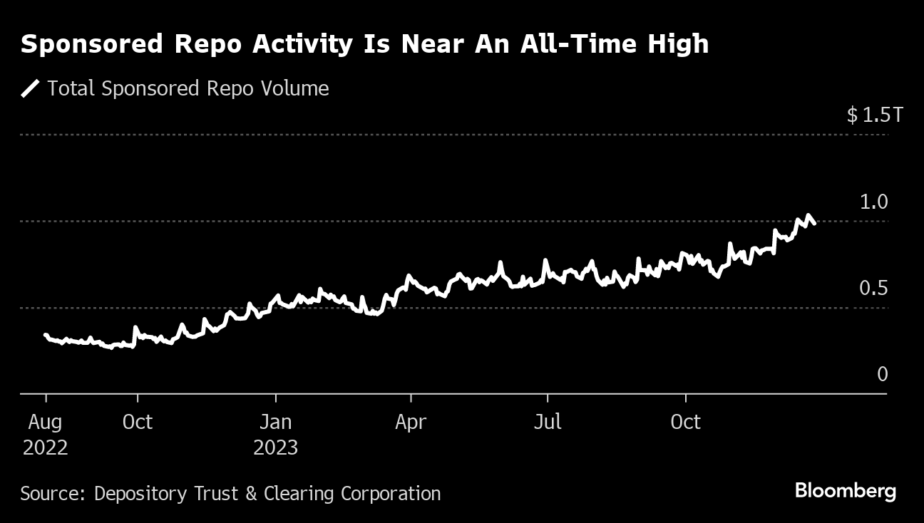 Total sponsored repo activity has risen, even reaching an all-time high $1.031 trillion as of Dec. 22, Depository Trust & Clearing Corp. data show. That's because sponsored repo transactions allow lenders to transact with counterparties like money-market funds and hedge funds, without bumping up against regulatory constraints of their own balance sheets. These agreements are effectively “sponsored” or cleared via the Fixed Income Clearing Corp's repo platform, thereby allowing dealer-banks to net two sides of a trade and hold less capital against it.