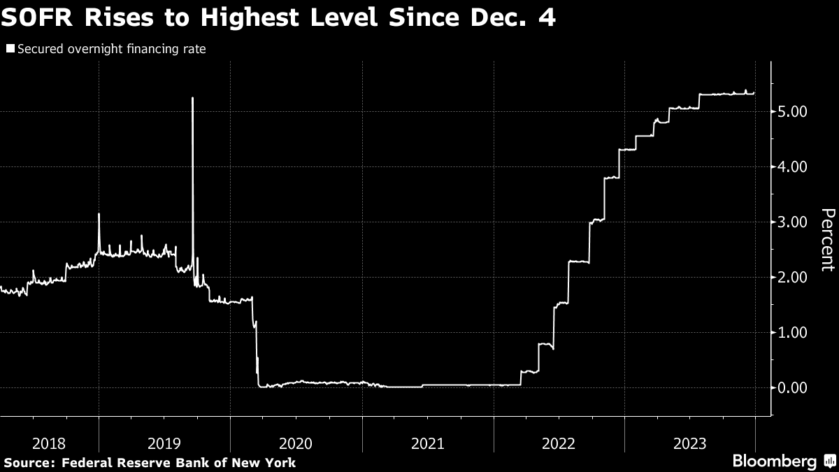 The Secured Overnight Financing Rate, or SOFR, is a reference rate connected to transactions of overnight repurchase agreements. When funding costs rise it tends to drive SOFR higher as well. SOFR fixed at 5.35% as of Dec. 26 from 5.32% the prior session, according to New York Fed data published Wednesday. That's off the all-time high of 5.39% reached on Dec. 1.