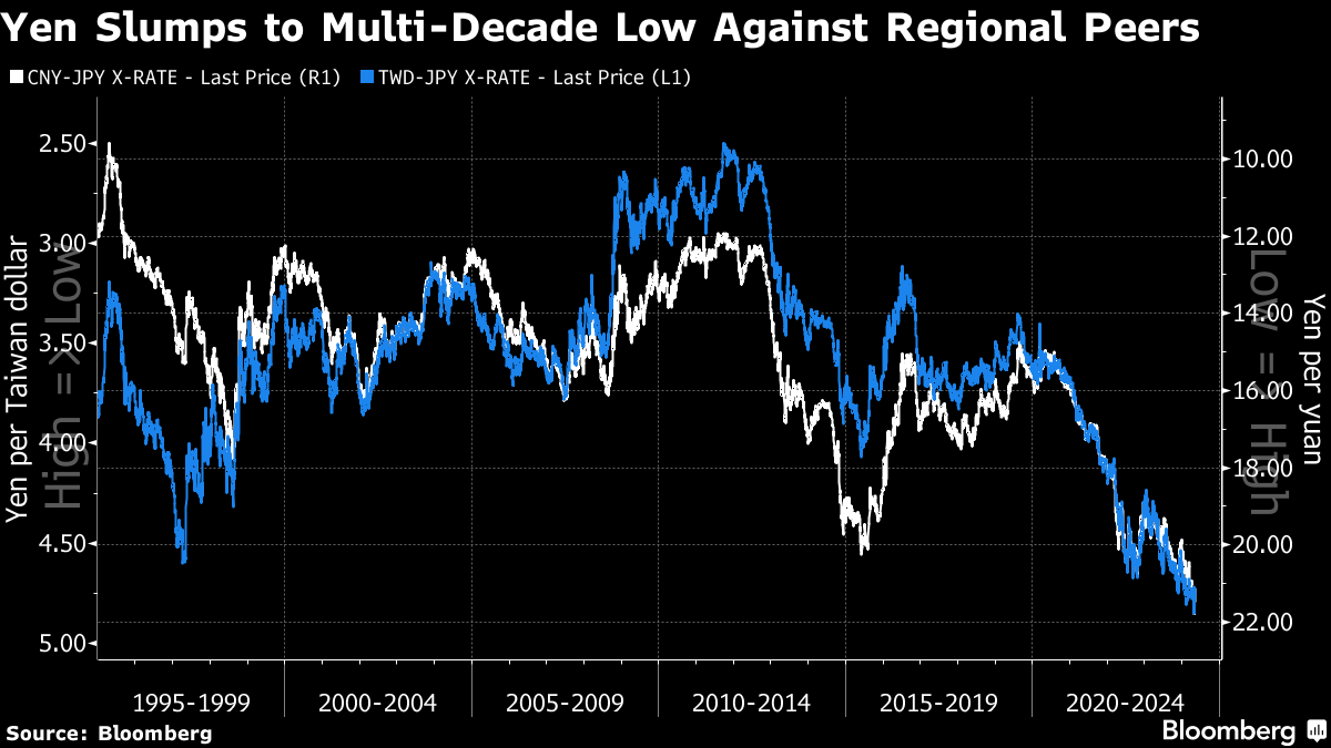 The yen fell to its lowest since 1992 against the yuan — the currency of Japan's biggest trading partner — in late April. It's near the weakest versus the won since 2008 and at a 31-year low against the Taiwan dollar.
