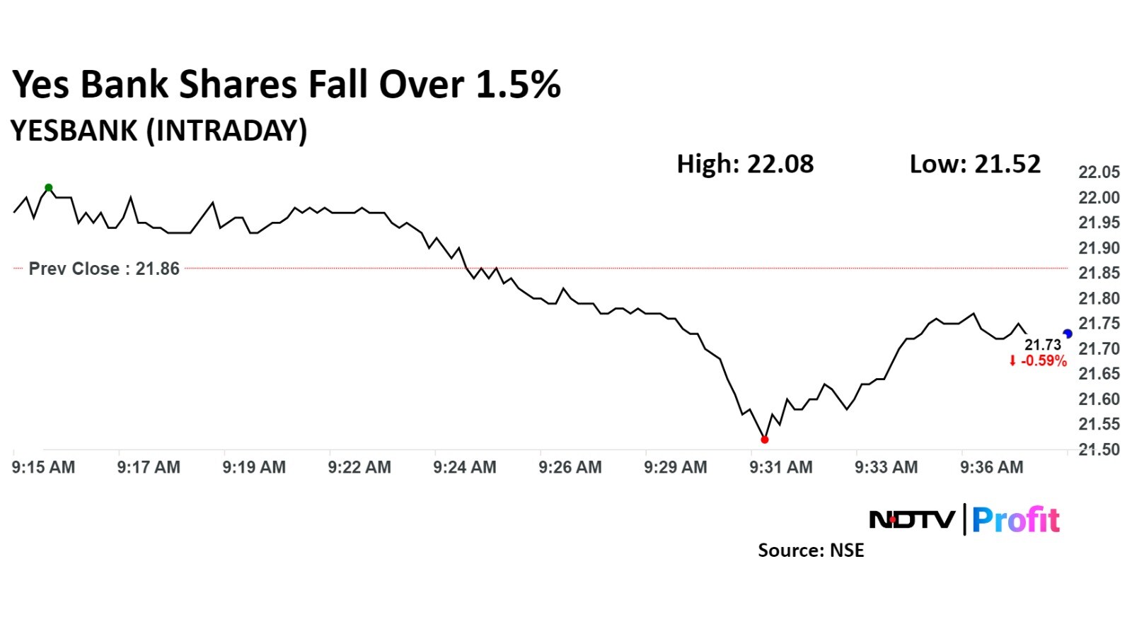 Yes Bank stock fell 1.56% in early trade on the quarterly business update, but erased losses to rise as much as 1.24% to Rs 22.13 apiece on the NSE. The stock was trading 0.55% higher at Rs 21.98 apiece, compared to a 0.09% advance in the benchmark Nifty 50 and a 0.25% advance in the Nifty Bank and as of 9:57 a.m.