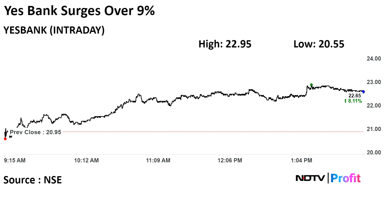 Yes Bank's stock rose as much as 9.55% during the day to Rs 22.95 apiece on the NSE. It was trading 9.07% higher at Rs 22.85 per share, compared to a 0.47% advance in the benchmark Nifty 50 as of 2:15 p.m.