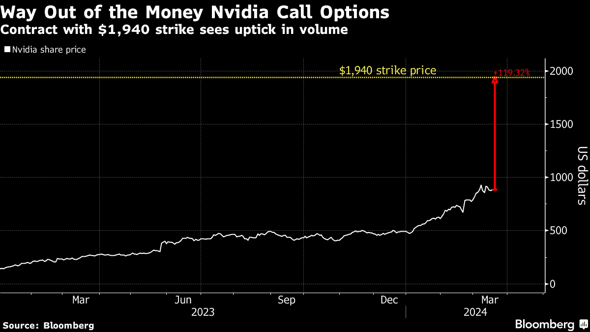 Just look at the options activity on Monday, when traders bet that shares of the $2.2 trillion chipmaker will more than double its $885 price — by the weekend. Nvidia is no stranger to triple-digit gains after soaring 231% in 2023 on optimism for its semiconductors used in artificial intelligence technology. But pulling that off in less than a week would be quite a reach, even for the hottest stock in the market.