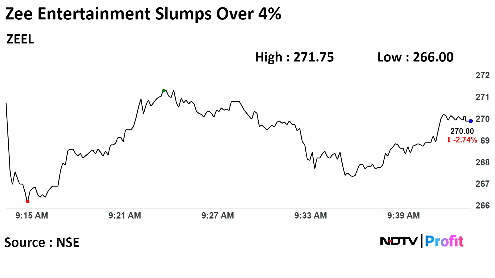 Zee's stock fell as much as 4.18% in early trade to Rs 266.00 apiece on the NSE. It was trading 2.76% lower at Rs 269.95 apiece compared to a 0.09% decline in the benchmark Nifty 50 as of 9:35 a.m.
