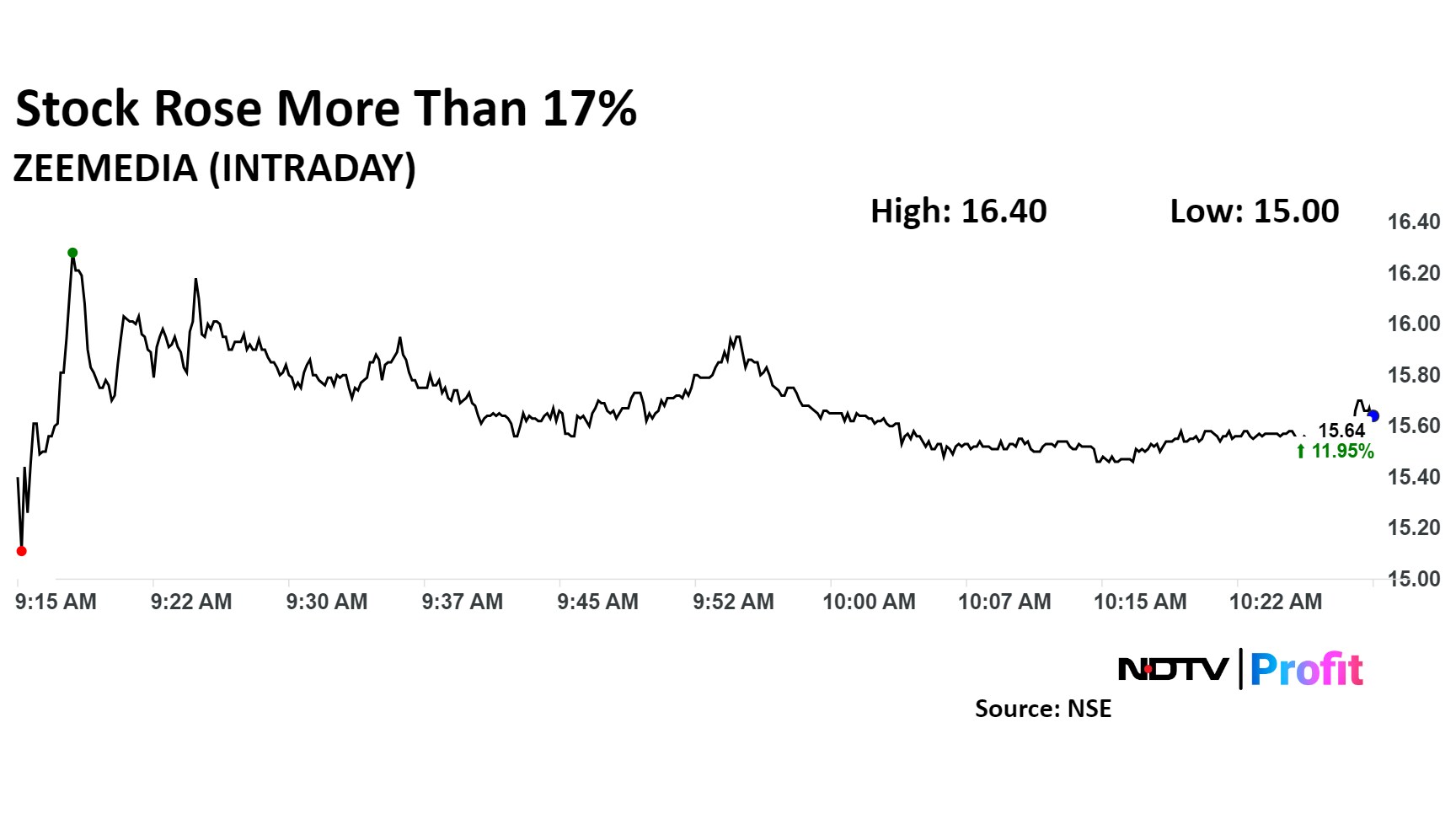 The scrip rose as much as 17.39% to Rs 16.40 apiece, the highest level since Feb.20. It pared gains to trade 11% higher at Rs 15.5 apiece, as of 10:29 a.m. This compares to a 0.1 decline in the NSE Nifty 50 index.