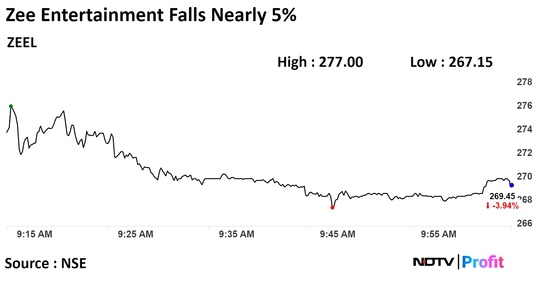 On the NSE, Zee's stock fell as much as 4.76% during the day to Rs 267.15 apiece. It was trading 4.37% lower at Rs 268.25 apiece compared to a 0.31% decline in the benchmark Nifty 50 at 10.13 a.m.