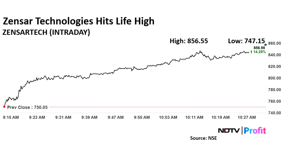 The shares of Zensar Technologies rose as much as 14.88% to Rs 861.65 apiece to hit fresh life high. It pared gains to trade 12.82% higher at Rs 846.20 apiece, as of 10:42 a.m. This compares to a 0.32% advance in the NSE Nifty 50.