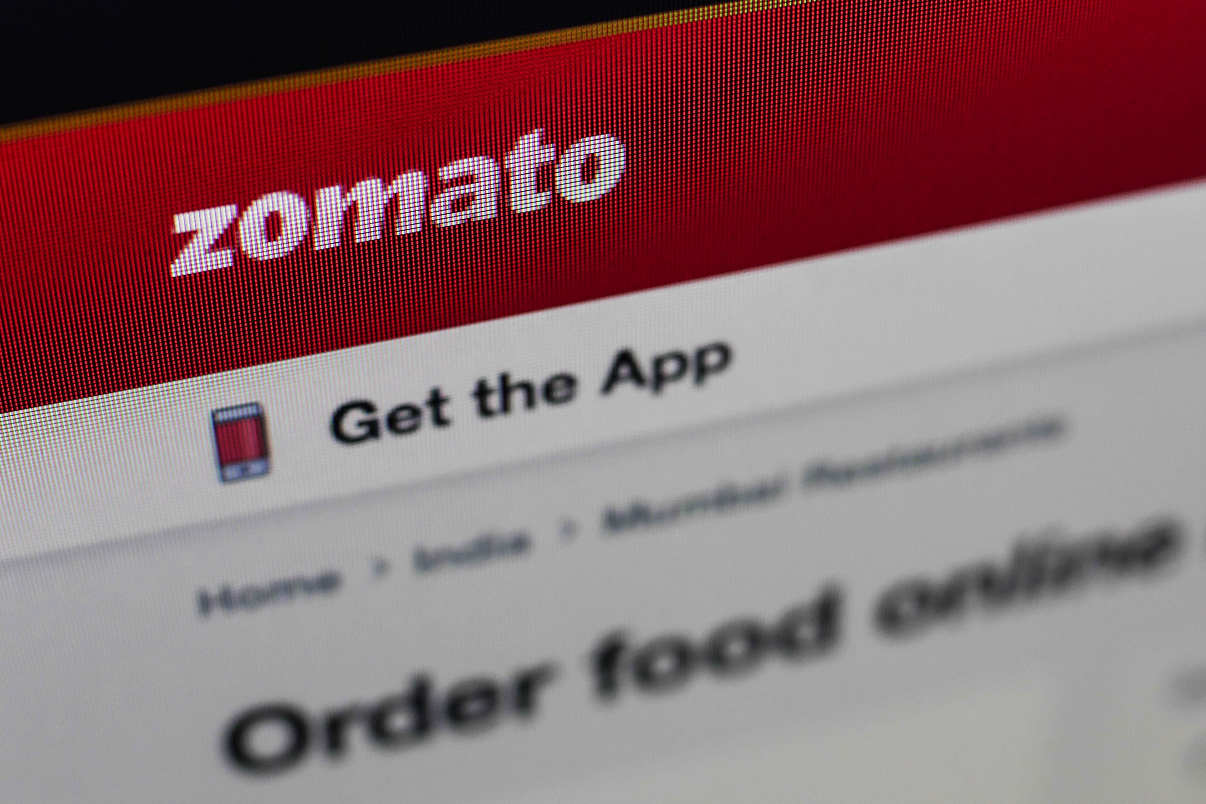 The logo of Zomato sits on the food delivery service company website. (Photographer: Dhiraj Singh/Bloomberg)