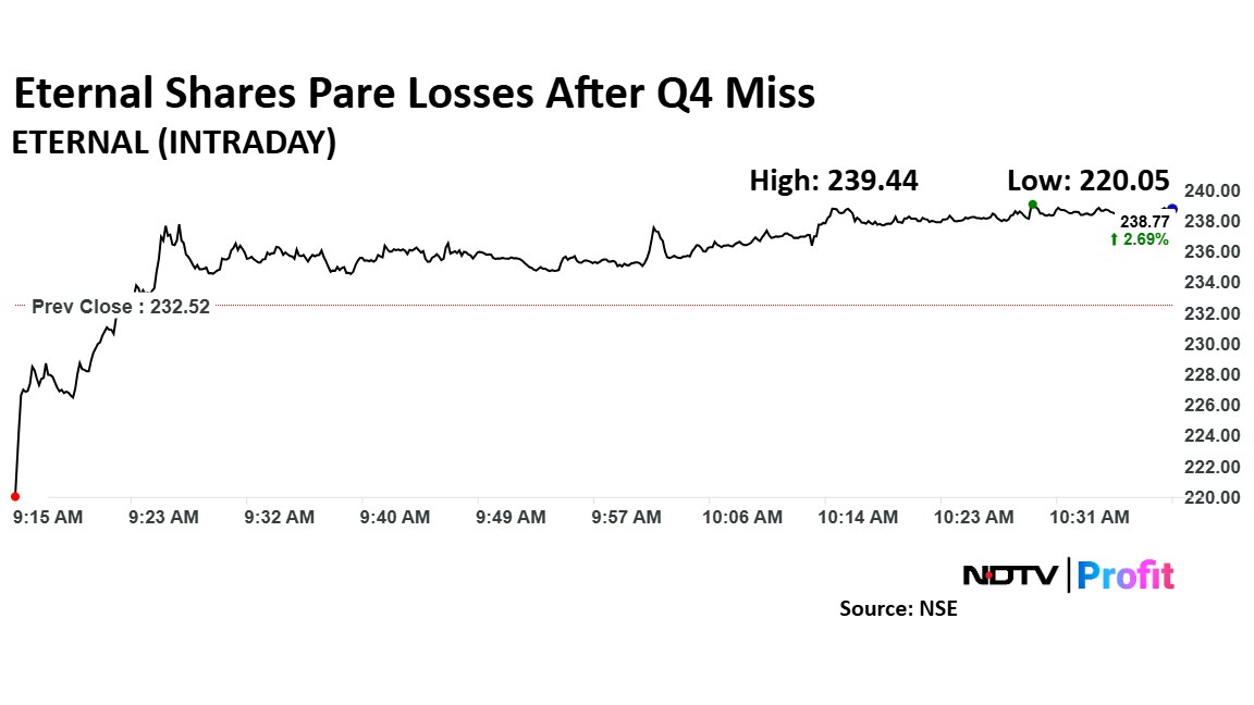 Eternal stock fell as much as 5.3% during the day to Rs 220.05 apiece on the NSE. It was trading 2.68% higher at Rs 238.76 apiece, compared to a 0.77% advance in the benchmark Nifty 50 as of 10:39 a.m.