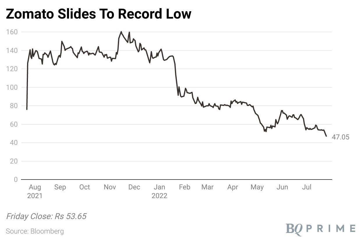 The online food aggregator's stock fell over 14% to Rs 46—a record low, before paring some losses and closing 11.2% lower at Rs 47.6 apiece.