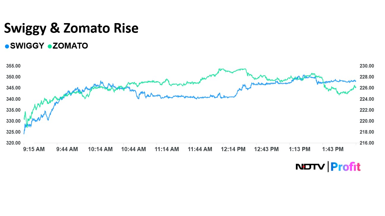 Swiggy and Zomato's share prices rose 7.88% and 3.39%, respectively, so far today. The stocks were trading 7.42% and 2.03% higher, respectively, as of 2:25 p.m., as compared to a 0.15% decline in the NSE Nifty 50 index.