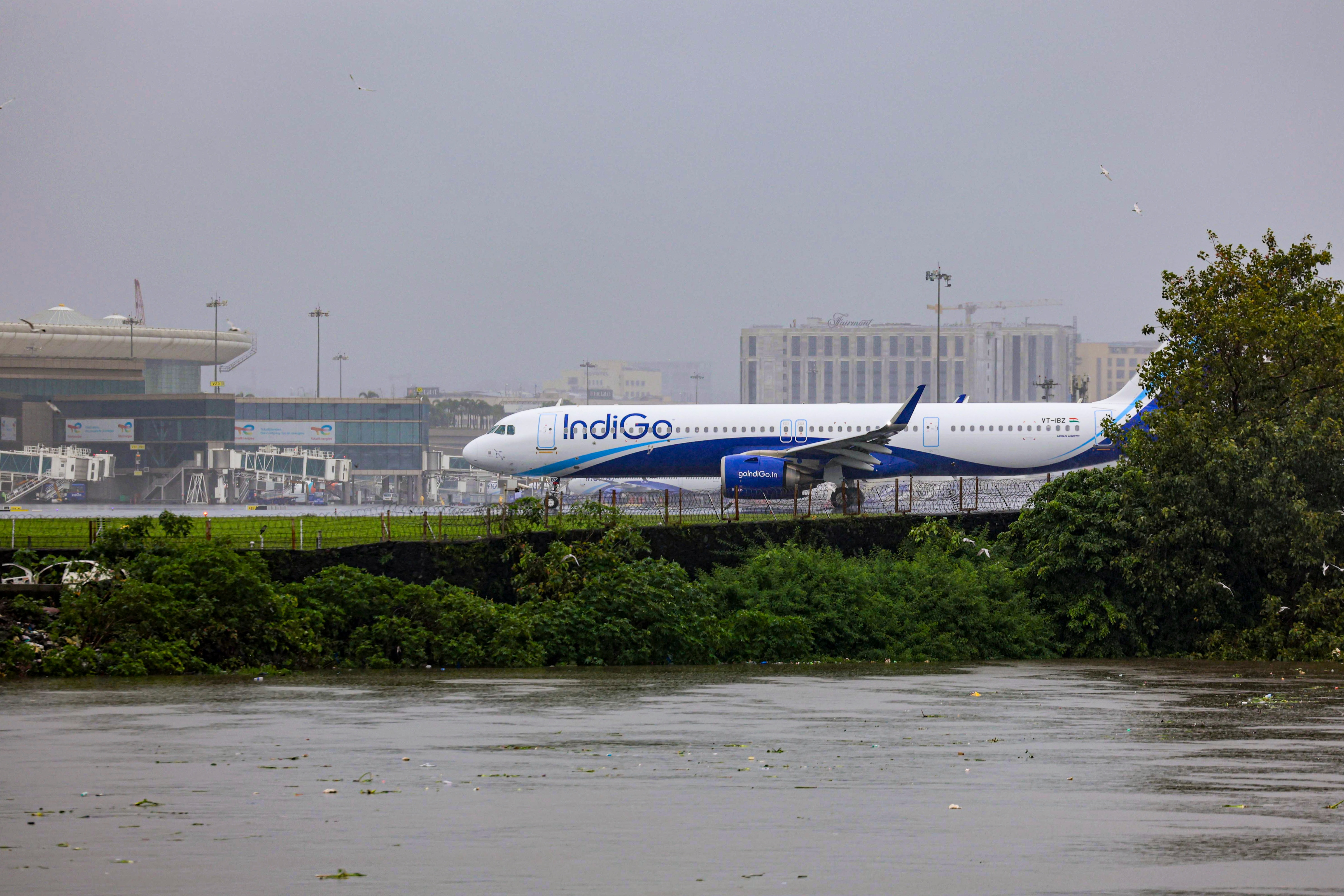 An IndiGo aircraft stationed at Chhatrapati Shivaji Maharaj International Airport amid the rising water level of the nearby Mithi River due to heavy rainfall, at Kurla. (Image: PTI)