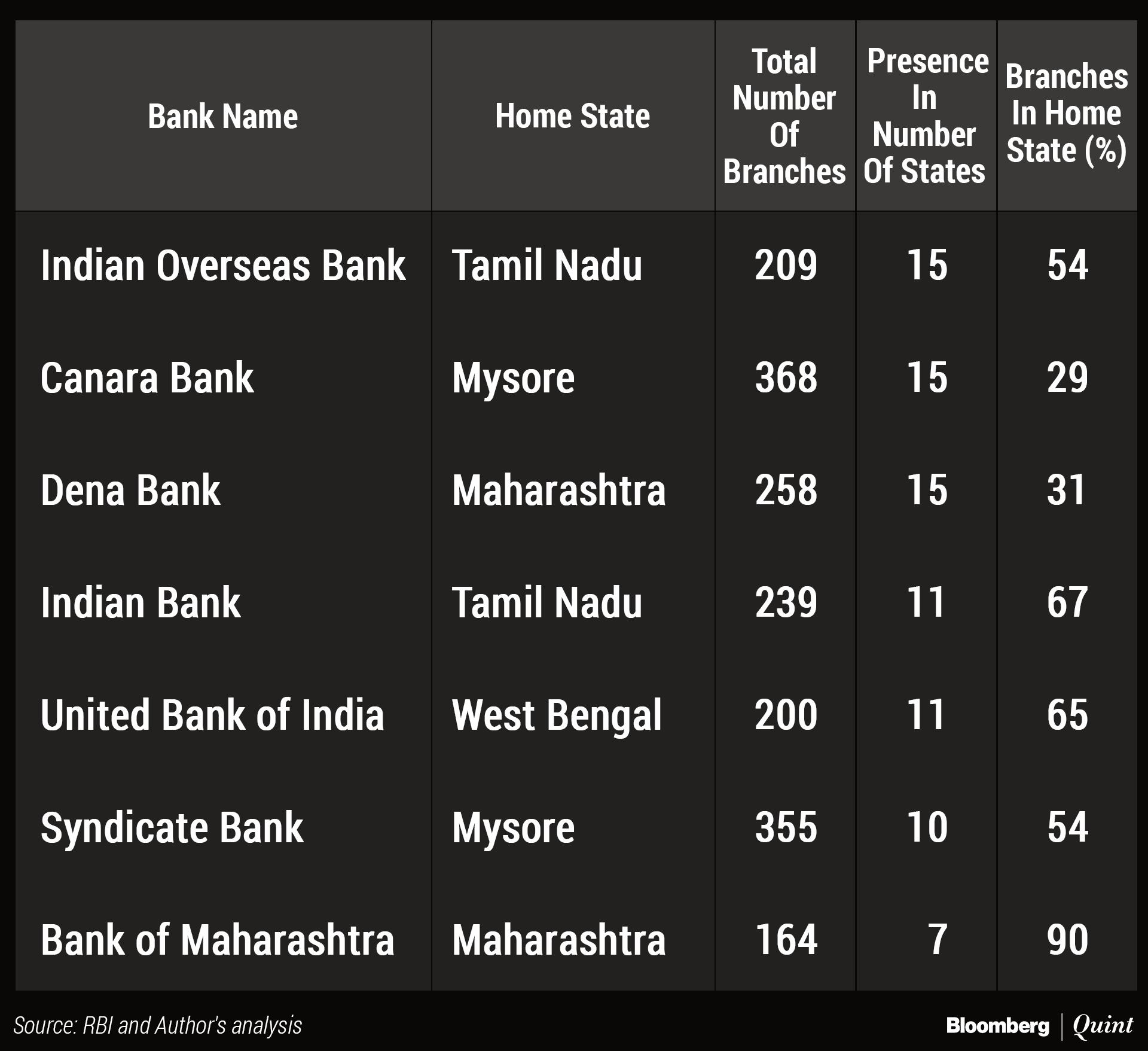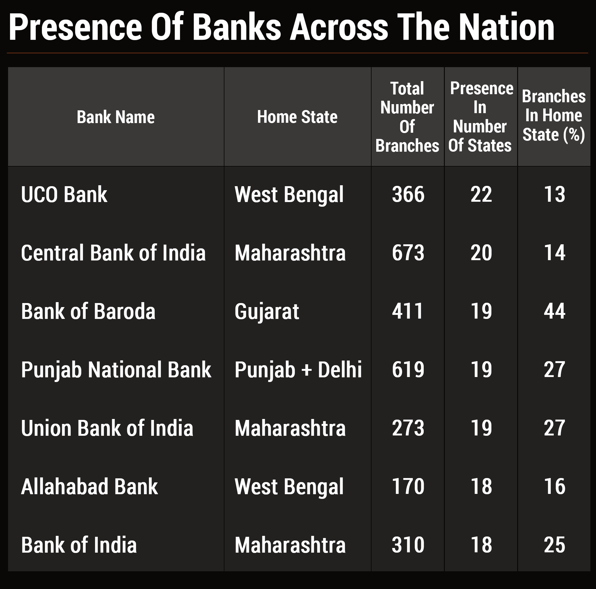 UCO Bank had a presence in 22 states which was the highest among the 14 banks. UCO Bank also had the least number of branches in its home state of West Bengal. Bank of Maharashtra had a presence in just seven states, which was the lowest. It had the highest percentage of its branches in the home state of Maharashtra.