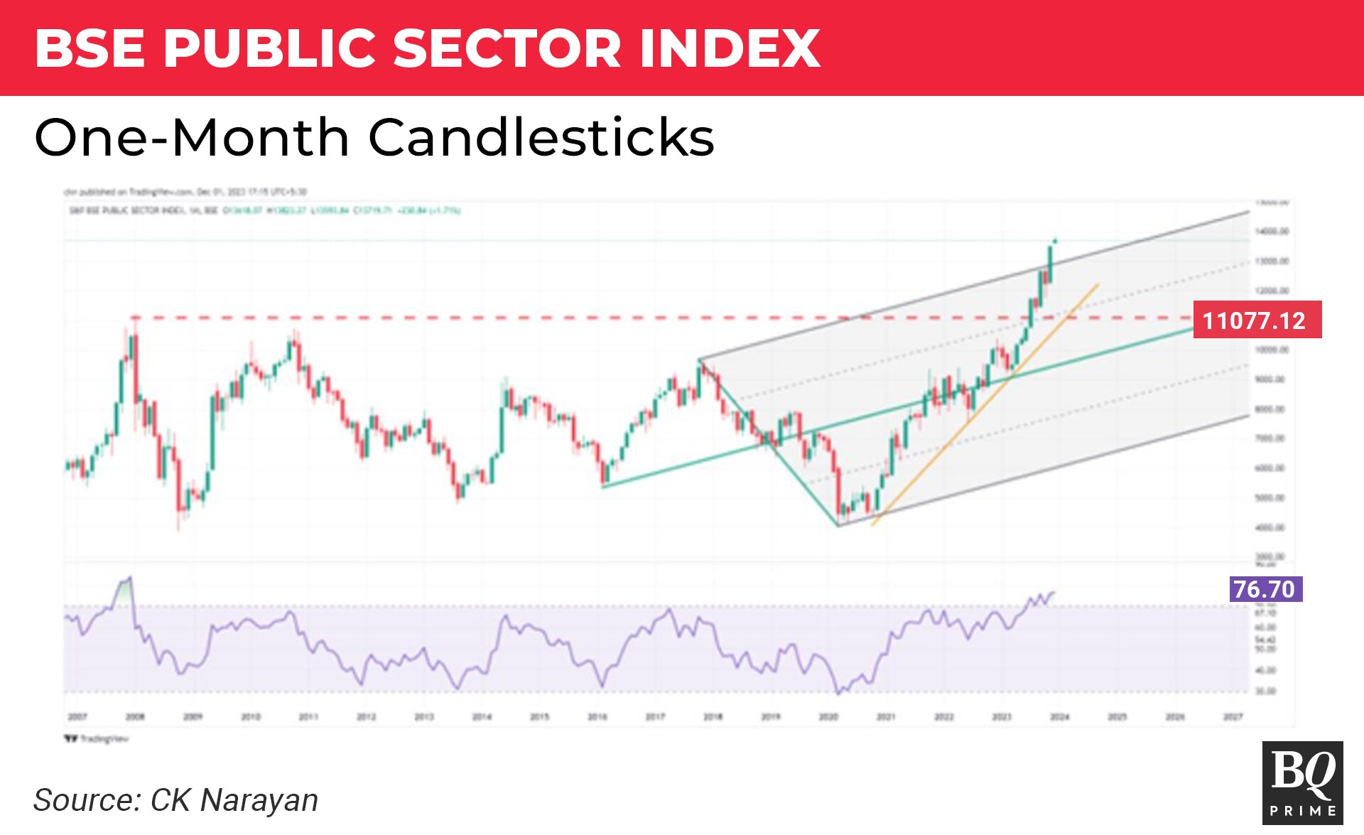 The strong GDP numbers indicate that certain sections are doing very well. Government thrust is propelling PSU counters higher and Chart 3 shows the BSE PSU index with a multi-month breakout.