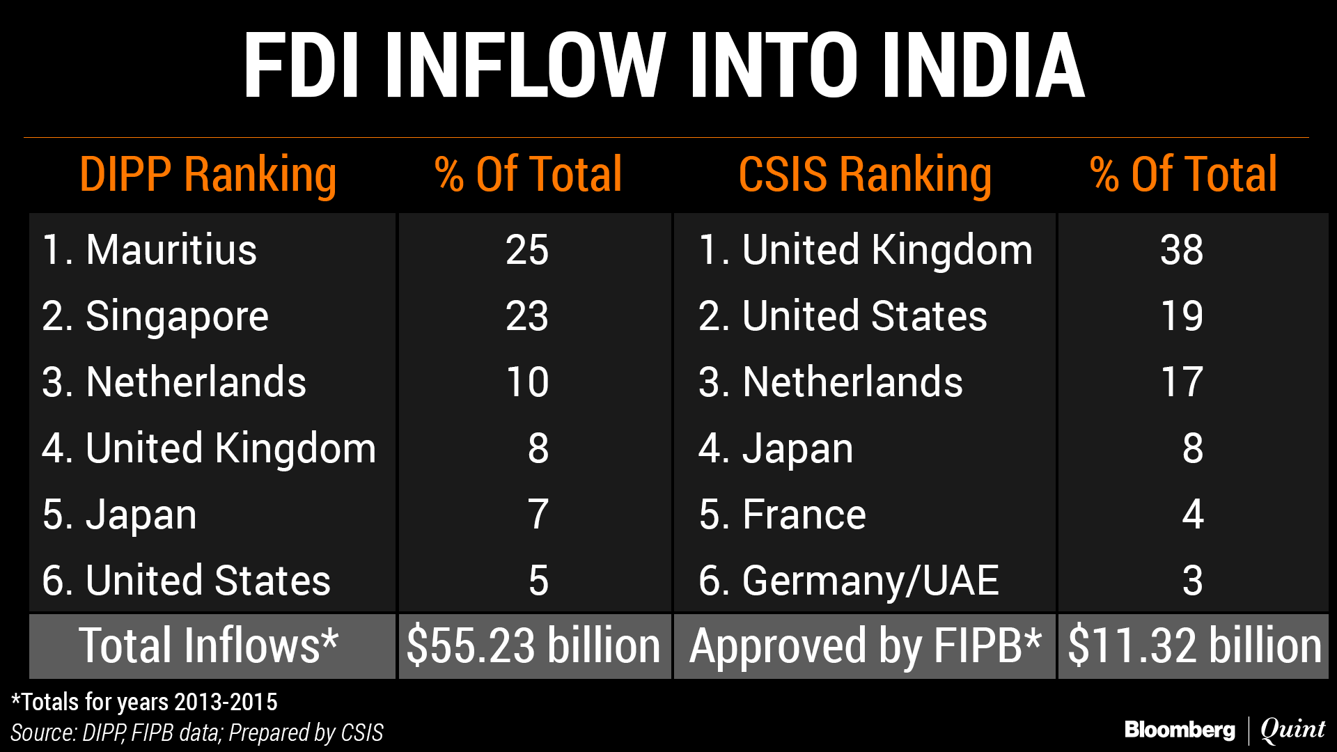 Every quarter India's Department of Industrial Policy and Promotion releases the most recent statistics on India's foreign direct investment inflows. It includes the monthly and annual totals, some historical information, the national source of that FDI, and sector-specific information. This ‘national source' data places the U.S. as the sixth-largest source of FDI inflows. Mauritius and Singapore rank first and second, respectively. While the U.S. may not be first, there is no conceivable way that Mauritius and Singapore (combined population of around 7 million) account for 51 percent of total FDI into India in the last 17 years.