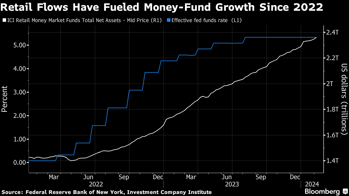 But a lot's changed since then. Traders have dramatically dialed back policy easing expectations, for one. The more time it takes the central bank to begin lowering its benchmark, the longer cash held in money-market funds should be able to earn 4%, 5% or more, keeping investors from looking further afield.