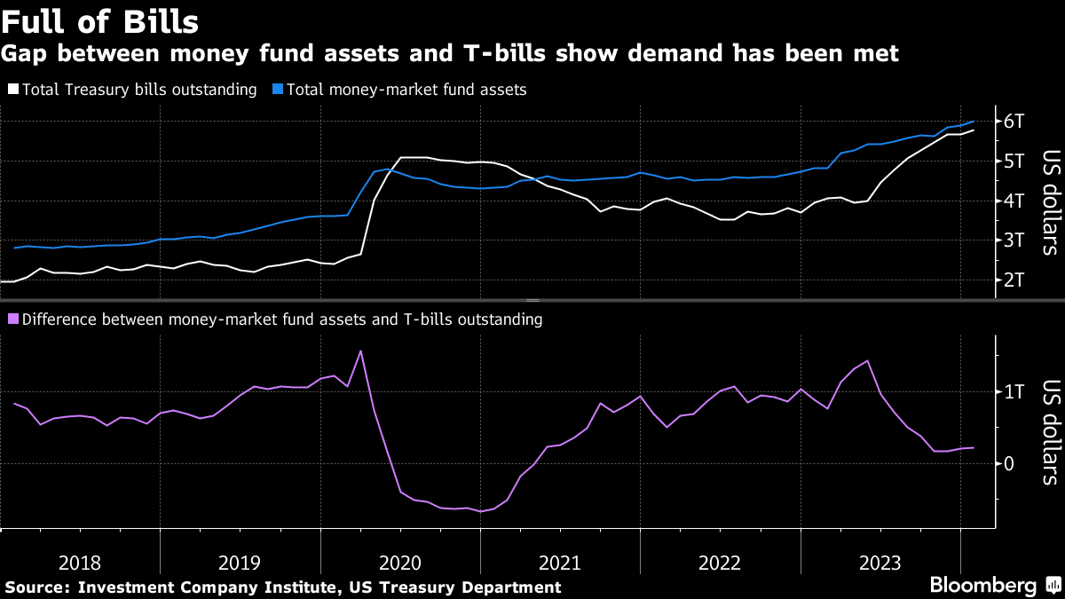 Investors have added $128 billion to US money-market funds since the start of the year, Investment Company Institute data show. Companies were sitting on a record $4.4 trillion of cash at the end of the third quarter, and after a flood of more than $1 trillion of T-bills since mid-2023, the market has room for more.