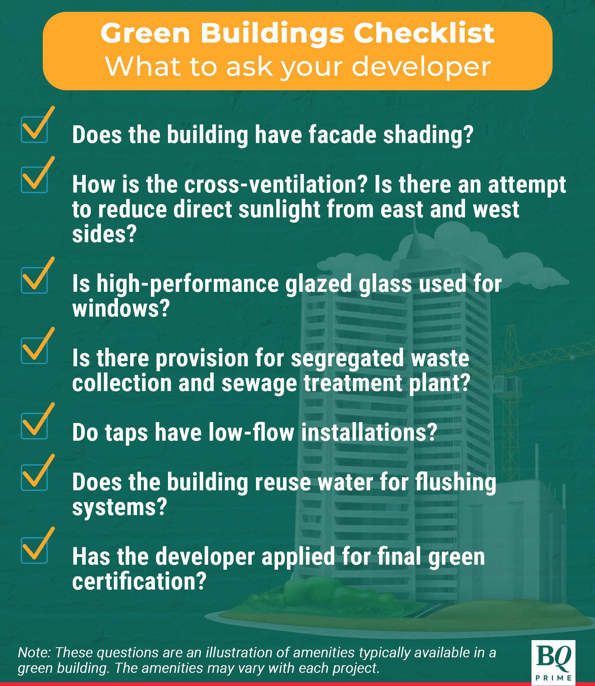 From a buyer's perspective, that means having power from renewables, water reuse for toilet flushes, low-flow taps to cut wastage, segregated garbage collection, facades that reduce heat, cross ventilation to reduce the use of air conditioners, and concrete that has lower carbon footprint, among others.