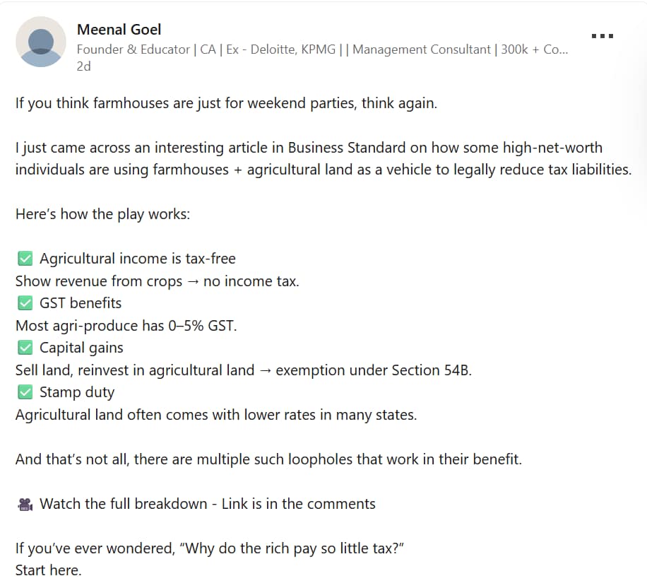 Farmhouses in India may be weekend retreats, but for the wealthy, they are also a way to save taxes legally. Chartered Accountant Meenal Goel, founder of an AI startup, recently broke down the strategy in a detailed LinkedIn post.