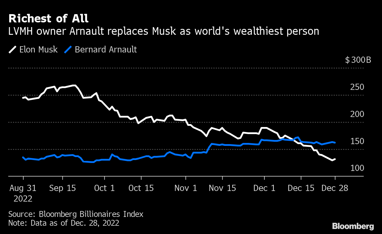 Musk is unseated as the world's richest person by Arnault, the French luxury tycoon behind LVMH. While Arnault hasn't been immune to the tough 2022, down about $16 billion for the year, it pales next to Musk's losses of more than $138 billion. How did we get here? Take a market downturn, add an impulse purchase of an unprofitable, lightning rod social-media company, mix in a heap of leverage, more supply-chain woes and an insatiable desire for attention. Easy come, easy go.