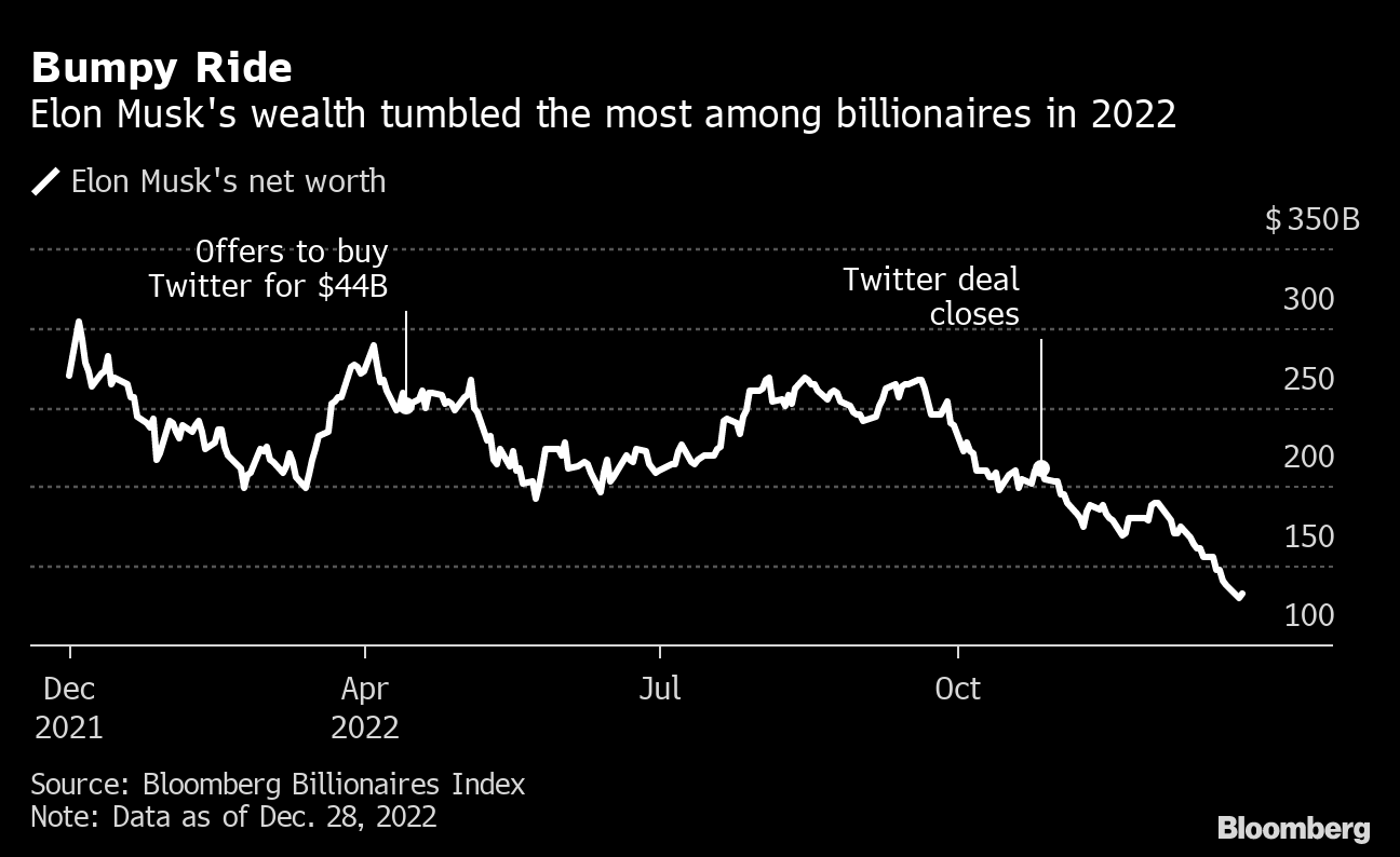 It's not just the money that was lost, though it was staggering — almost $1.4 trillion was wiped from the fortunes of the richest 500 alone, according to the Bloomberg Billionaires Index. Plenty of the pain, it turns out, was self-inflicted: The alleged fraud by onetime crypto wunderkind Sam Bankman-Fried; the devastating war waged by Russia on Ukraine that spurred crippling sanctions on its business titans; and, of course, the antics of Elon Musk, the new owner of Twitter who's worth $138 billion less than he was on Jan. 1.