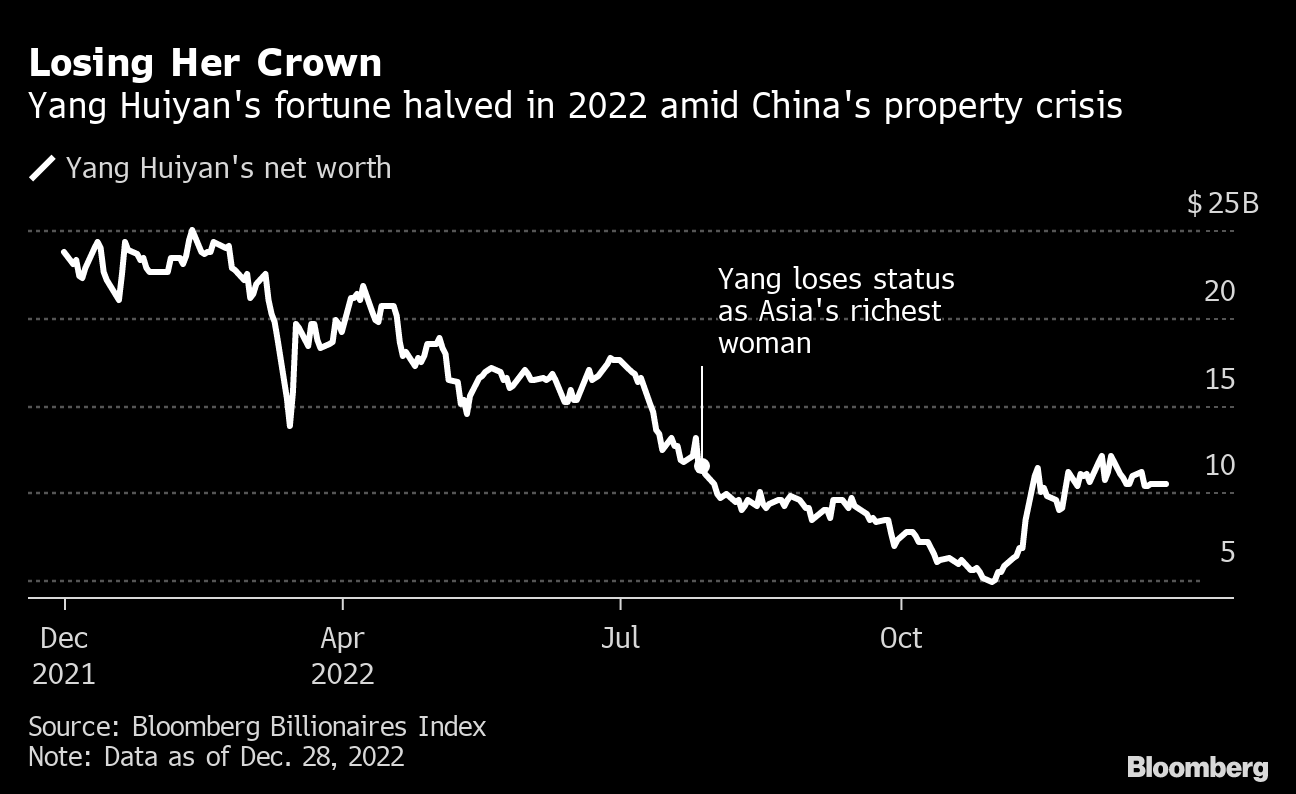 Yang Huiyan loses the title of Asia's wealthiest woman after her fortune more than halves over seven months amid China's unfolding property crisis. Country Garden Holdings, the developer that Yang inherited from her father in 2005, benefited from a dizzying homebuilding spree in recent years. But the country's efforts to curb real estate prices and Xi's crackdown on consumption put a stranglehold on the sector, stalling projects and leading frustrated homeowners to quit paying mortgages on halted developments. Country Garden's stock price — and Yang's wealth — has yet to recover.