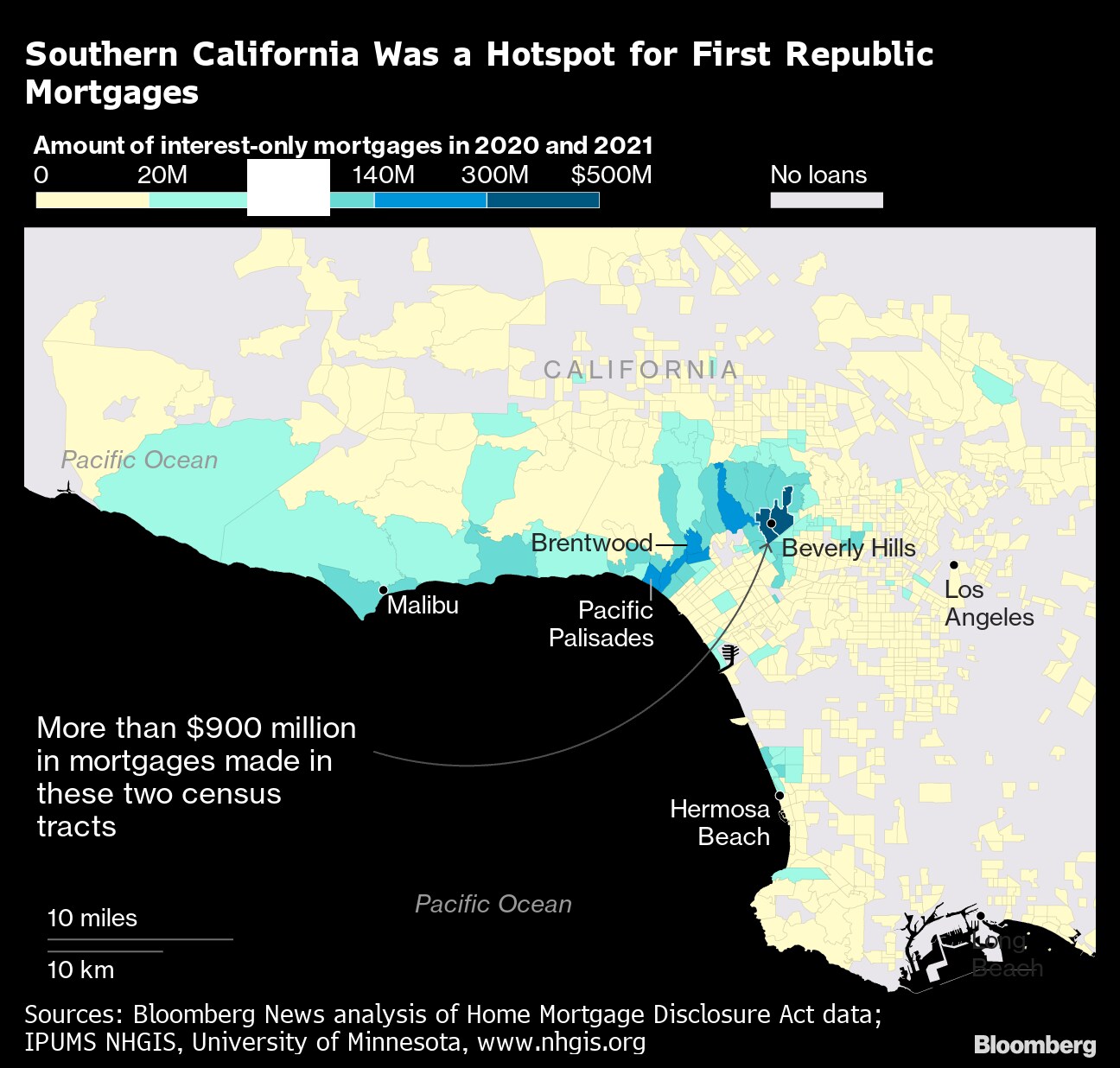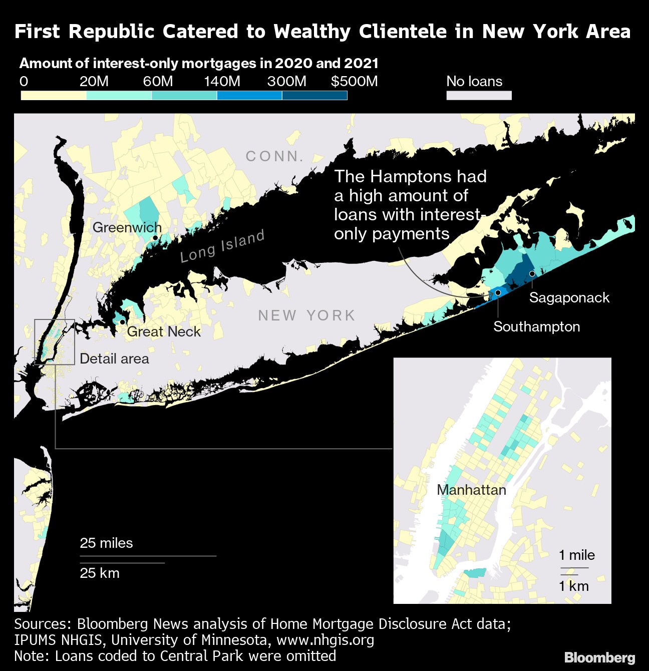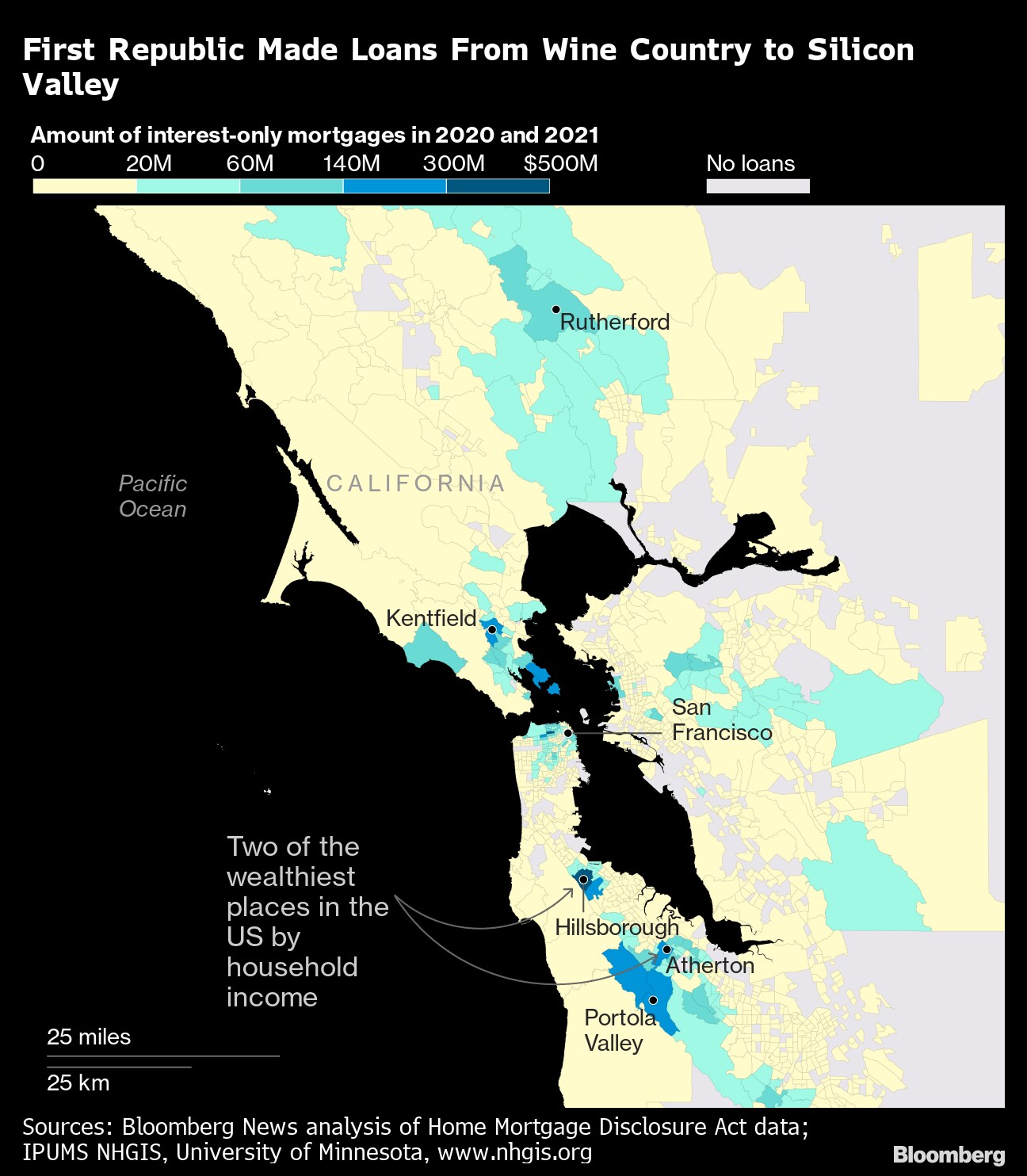 The firm's annual reports show the business grew for years and then took off as interest rates bottomed out in 2020 and 2021. In that period, a Bloomberg News analysis of Home Mortgage Disclosure Act records shows that the bank made more than $19 billion in mortgages with interest-only payments in three metro areas alone: San Francisco, Los Angeles and New York. The debt also flowed in a big way to the Hamptons and the wine country north of San Francisco.
