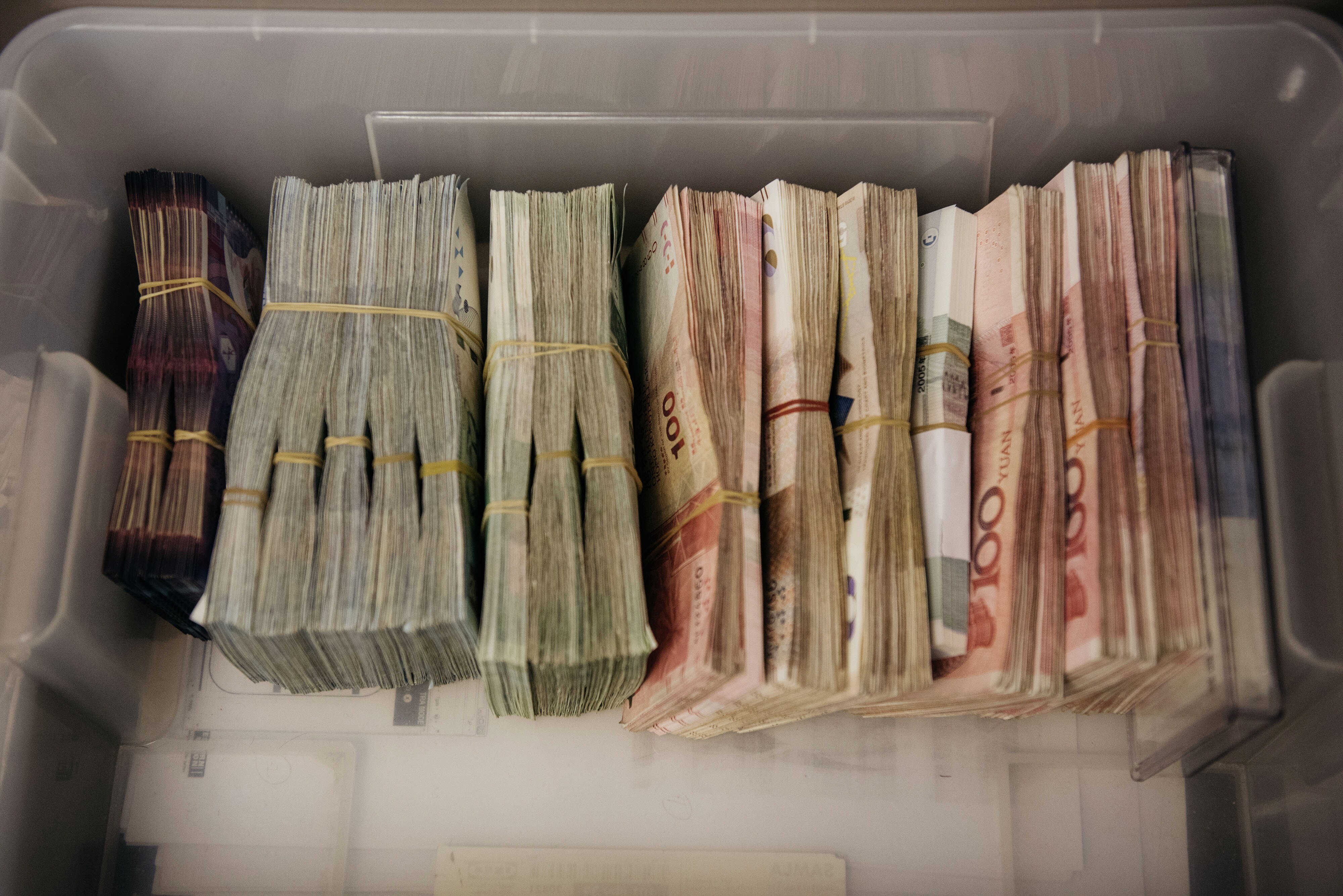 Bundles of banknotes sit inside a container at the Professional Foreign Currency Exchange Ltd. (PFCE) store in Hong Kong, China. (Photographer: Anthony Kwan/Bloomberg)