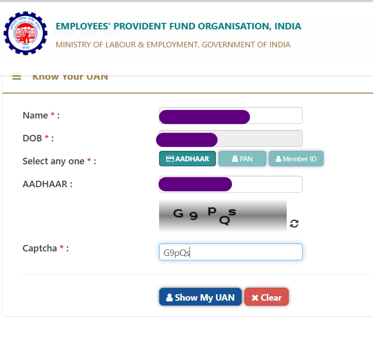 Step 6: You will be prompted to enter your Full Name, Date Of Birth and either Aadhaar, PAN or Member ID. Enter these required details and fill in the captcha code displayed on the screen.