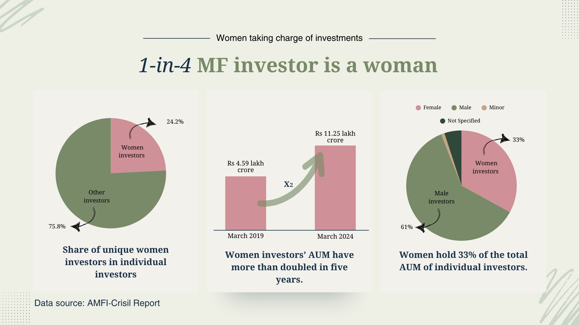 One in every four unique individual investors in mutual funds in India is a woman, reflecting a growing trend of women's financial empowerment, according to a joint report by the Association of Mutual Funds in India and Crisil. As of December 2024, women accounted for 25% of mutual fund investors, aided by increased financial awareness and targeted initiatives.