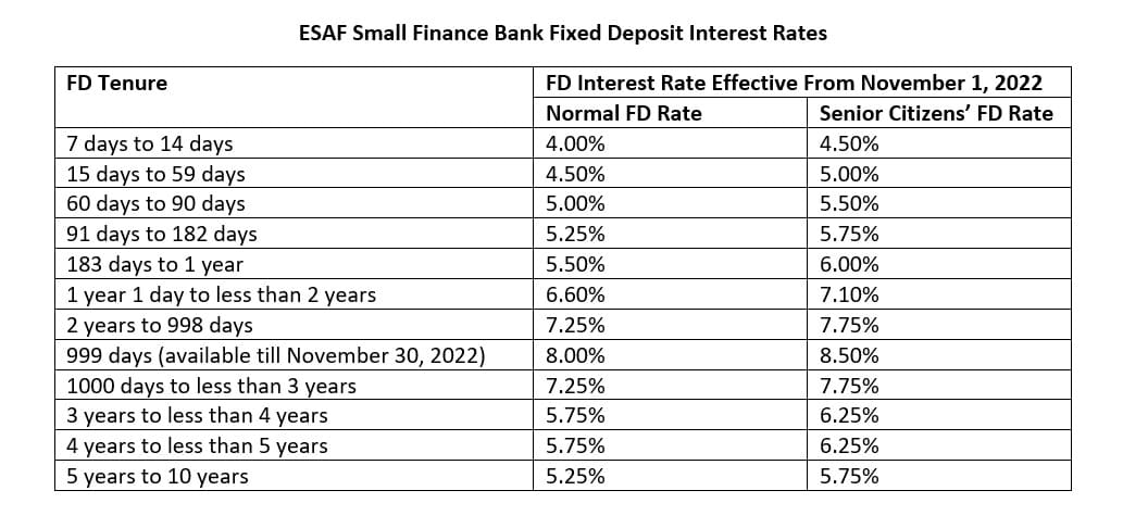 ESAF Small Finance Bank has introduced a special 999-day fixed deposit (FD) offering an interest rate of 8% for general citizens and 8.50% for senior citizens. This special FD will be available only till November 30, 2022.