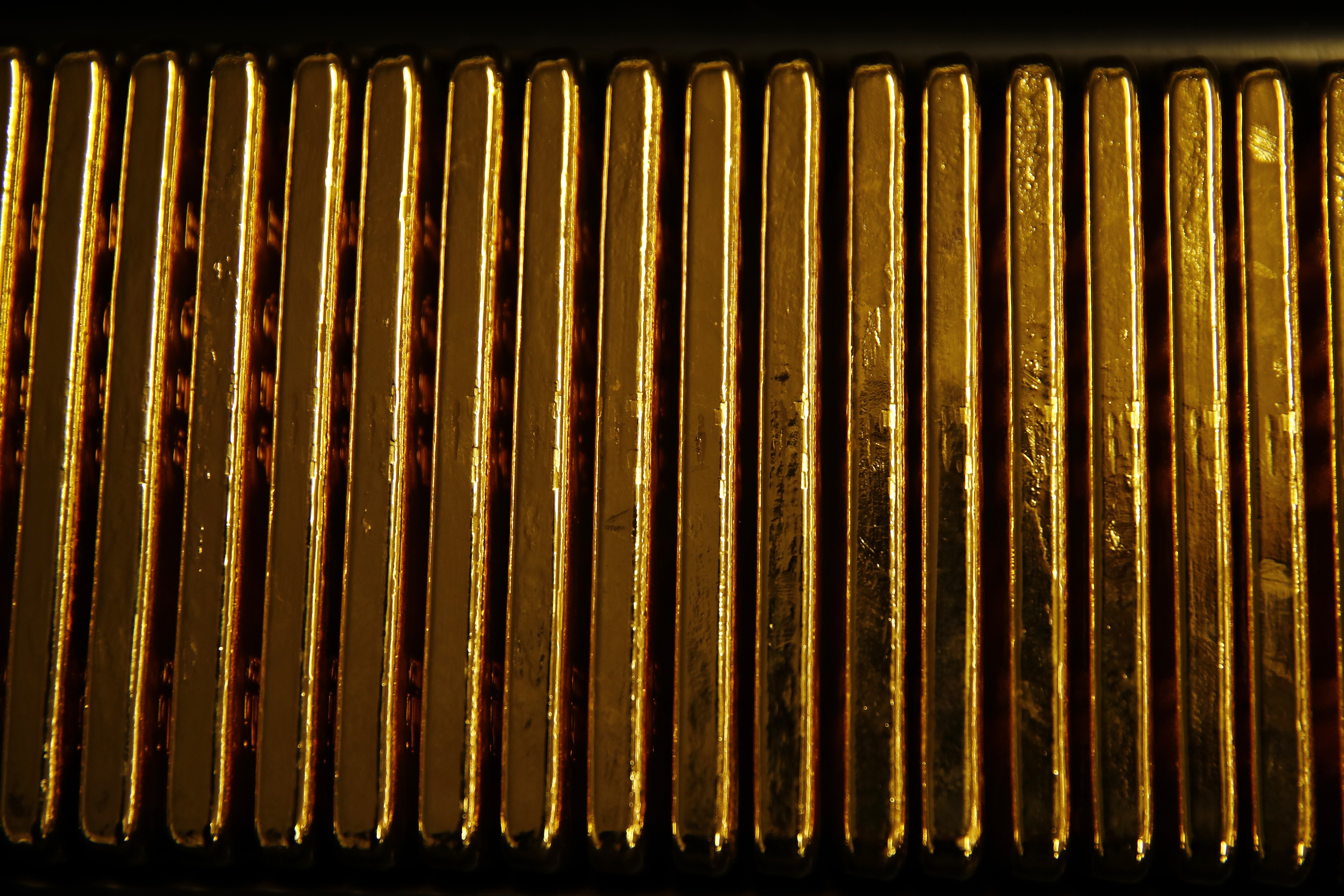 One kilogram bars of gold sit stacked in a row at a refinery in Switzerland. (Photographer: Stefan Wermuth/Bloomberg)