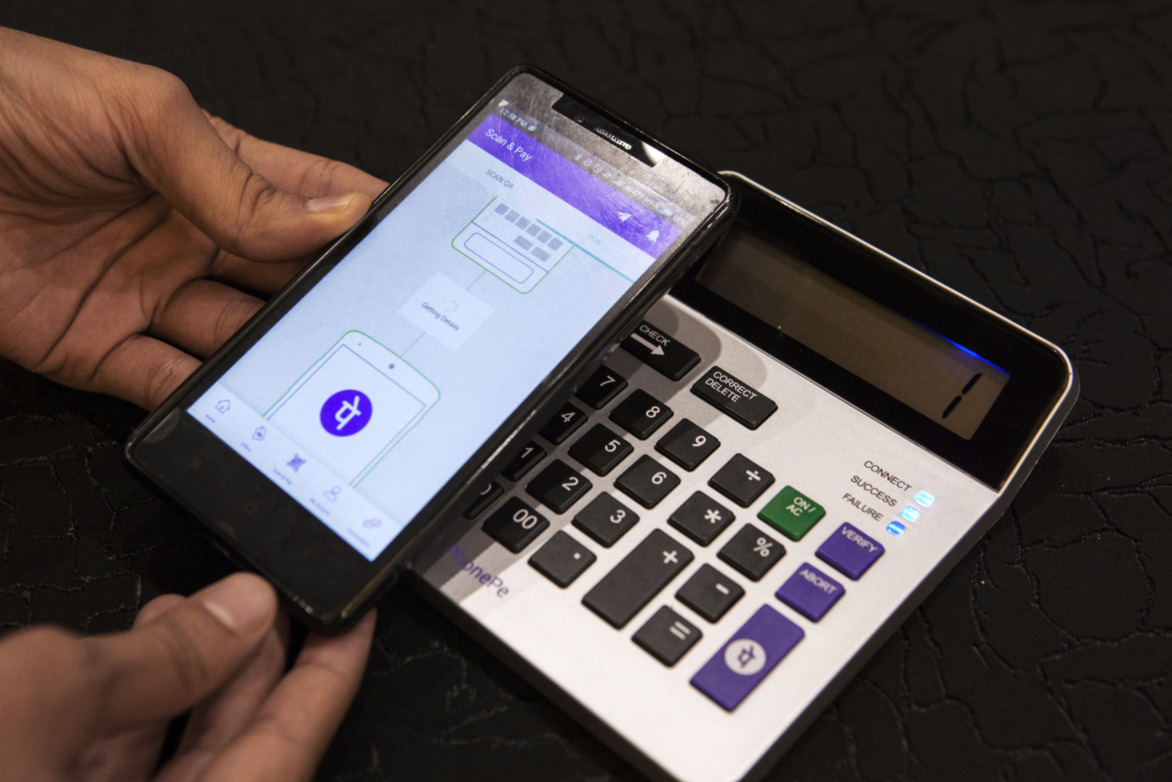 The PhonePe mobile app, on a smartphone, and a point of sale device are demonstrated during a product unveiling in Bengaluru, India. (Photographer: Samyukta Lakshmi/Bloomberg)