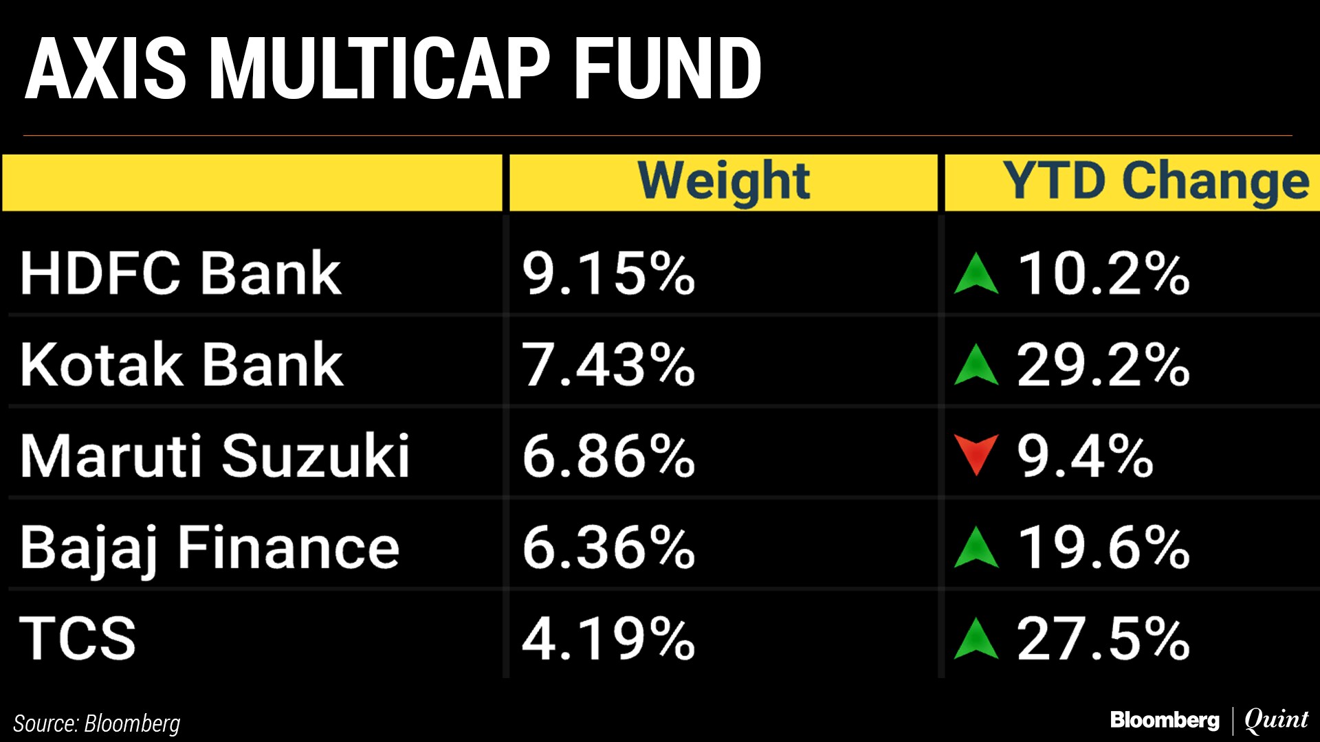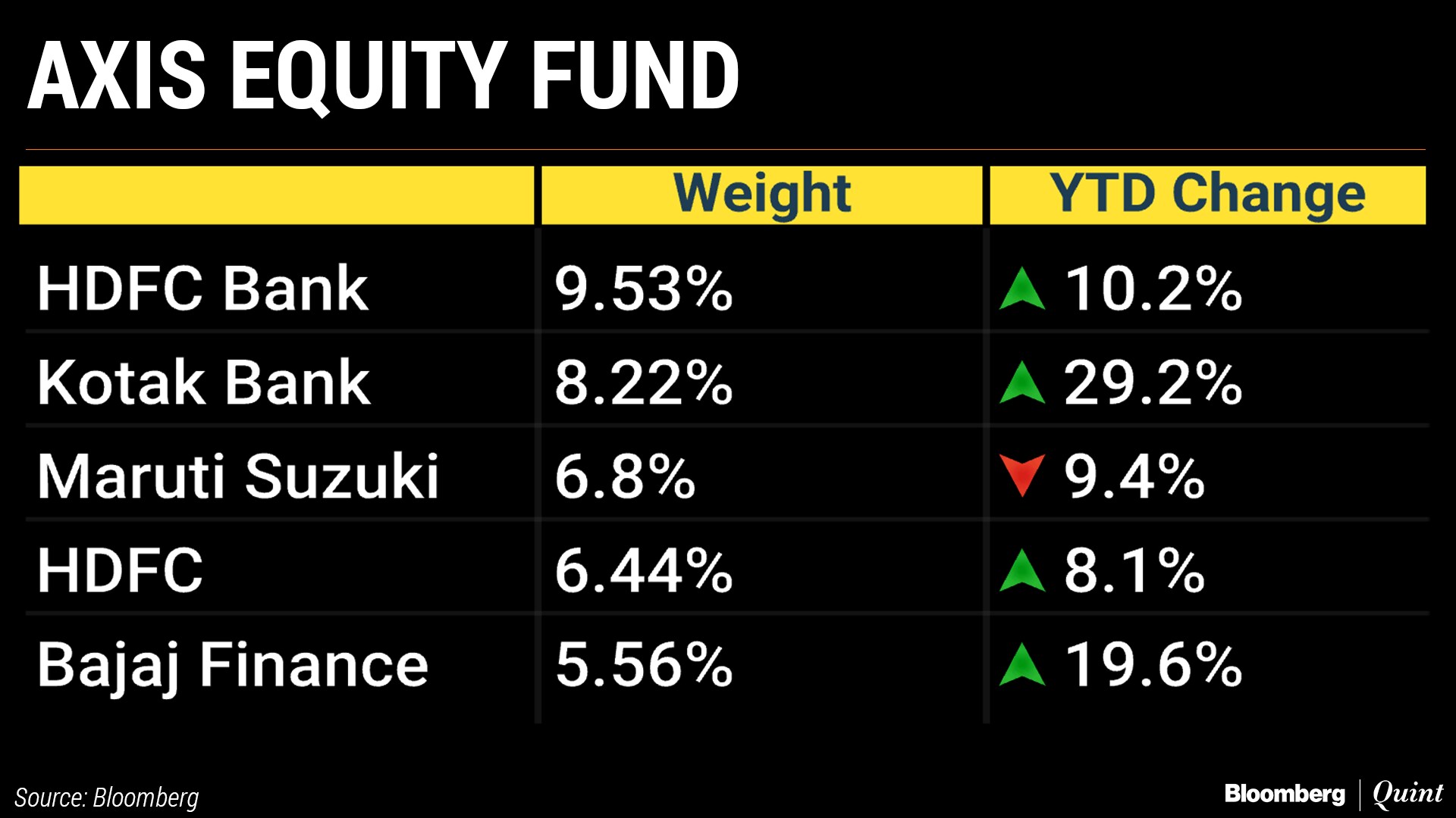 Just like the benchmark NSE Nifty 50 Index, all three funds are skewed towards financial stocks, with HDFC Bank Ltd. being the common thread among them. Maruti Suzuki India Ltd., which has fallen nearly 9 percent in 2018, is a top holding for both Axis Mutual Fund schemes.
