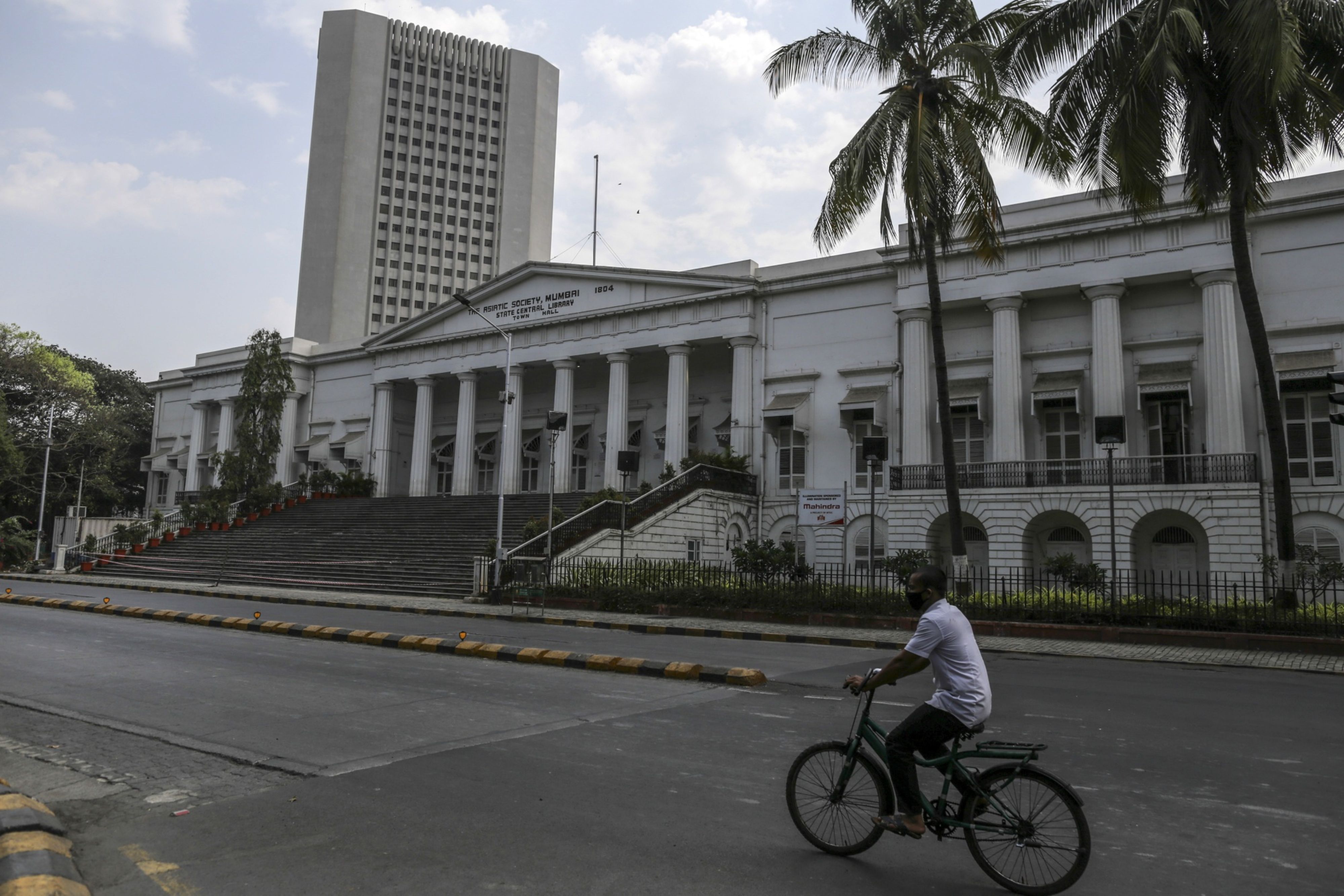 A cyclist rides along an empty street past the Reserve Bank of India headquarters during a lockdown imposed due to the coronavirus in Mumbai. (Photographer: Dhiraj Singh/Bloomberg)