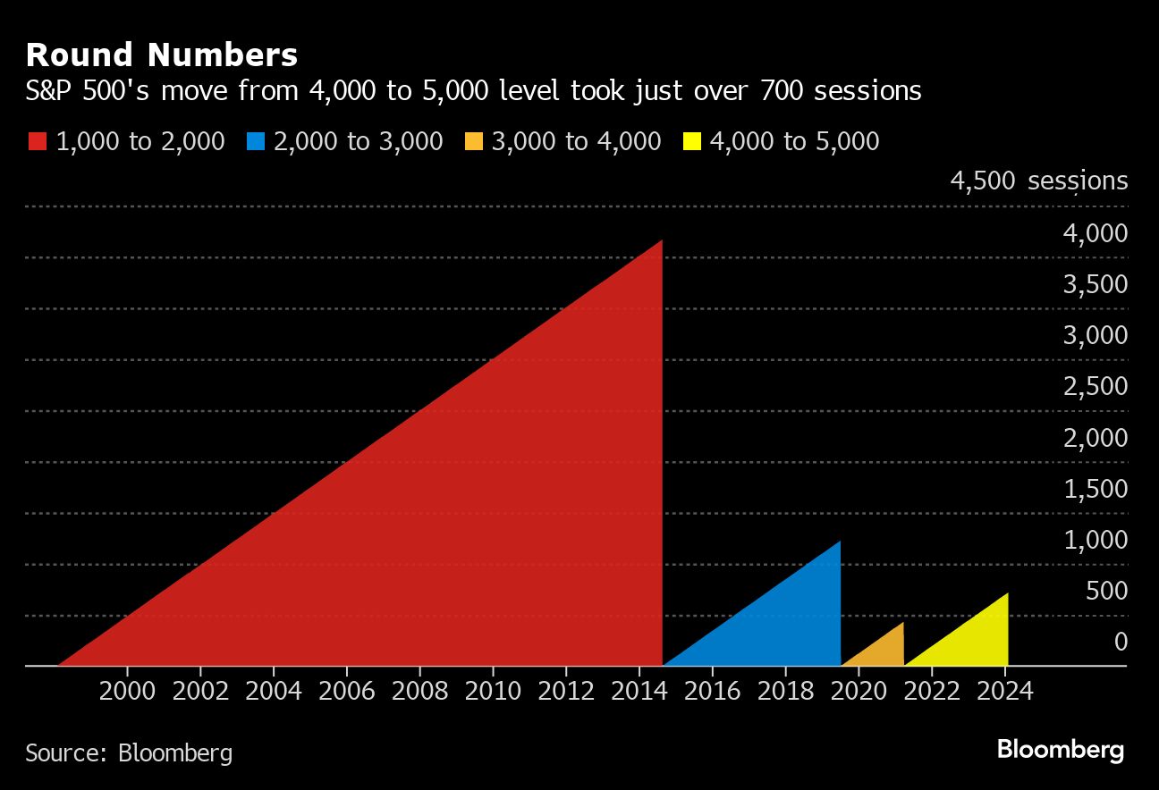 (Bloomberg) -- With the S&P 500 closing above 5,000 for the first time, there's an inevitable question for investors with cash on the sidelines: Should I get in now — or is the milestone moment actually a reason not to invest?