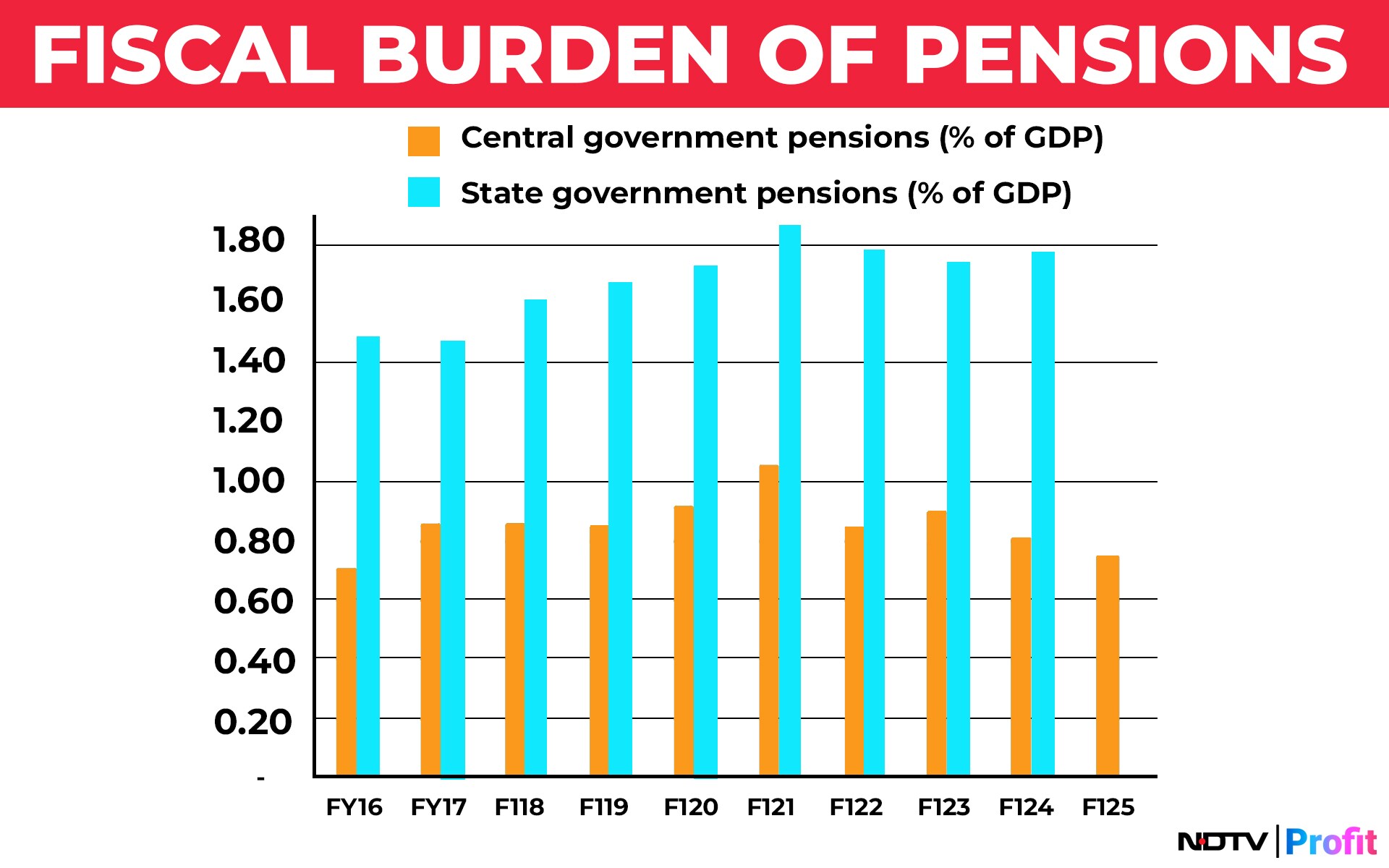 "State governments witnessed a sharp rise in the pension burden to almost 1.9% of GDP in FY21, and in the past few years, it has remained sticky at 1.7-1.8% of GDP," stated the report.