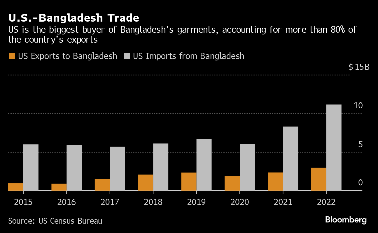 About $9 billion, or roughly one-fifth, of Bangladesh's clothing exports went to the US in 2022, with Walmart Inc. and Gap Inc. being the top buyers. The garment industry employs around 4 million workers and contributes about 10% to the $460 billion economy.
