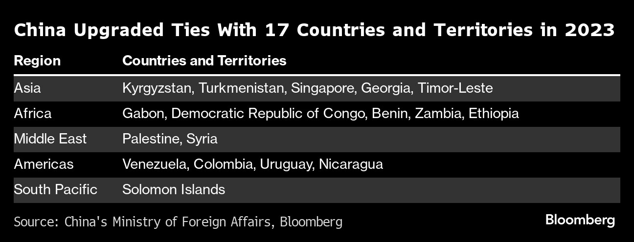 Beijing elevated the way it described ties with 17 countries and territories, most of them from the developing world, according to a Bloomberg analysis of statements issued by the foreign ministry. That's a pace not seen during Xi's first decade in office.