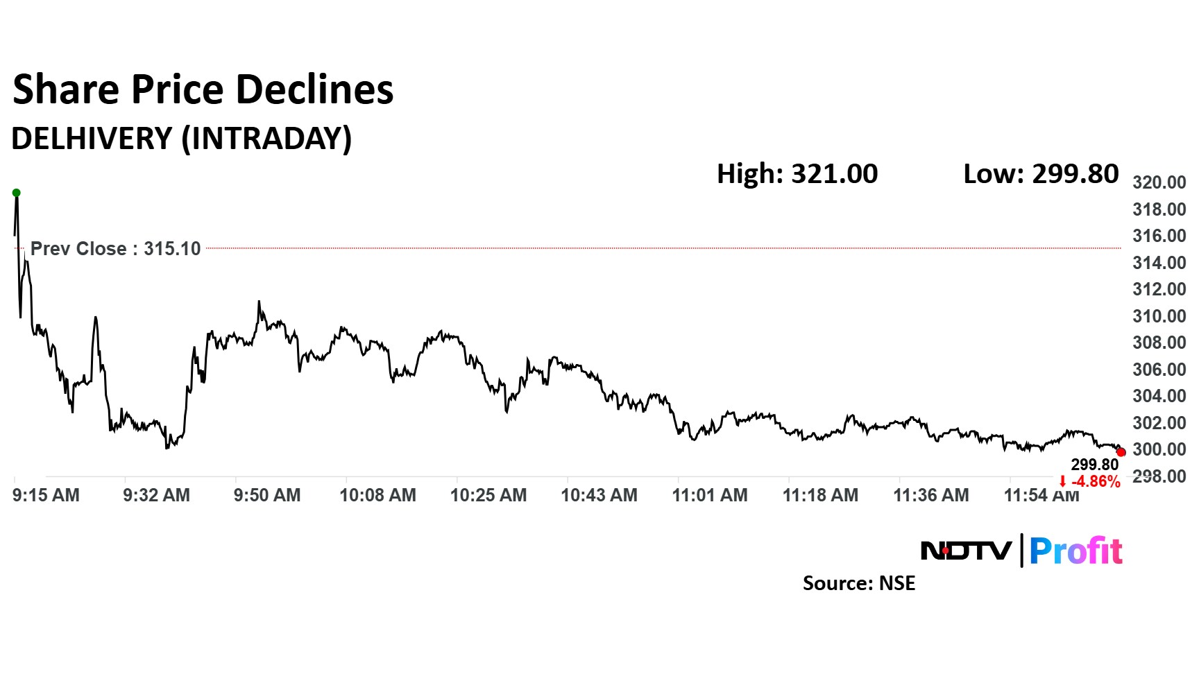 Shares of Delhivery fell as much as 4.86% to Rs 299 apiece. They pared losses to trade 4.51% lower at Rs 300 apiece, as of 12:08 p.m. This compares to a 0.89% decline in the NSE Nifty 50.