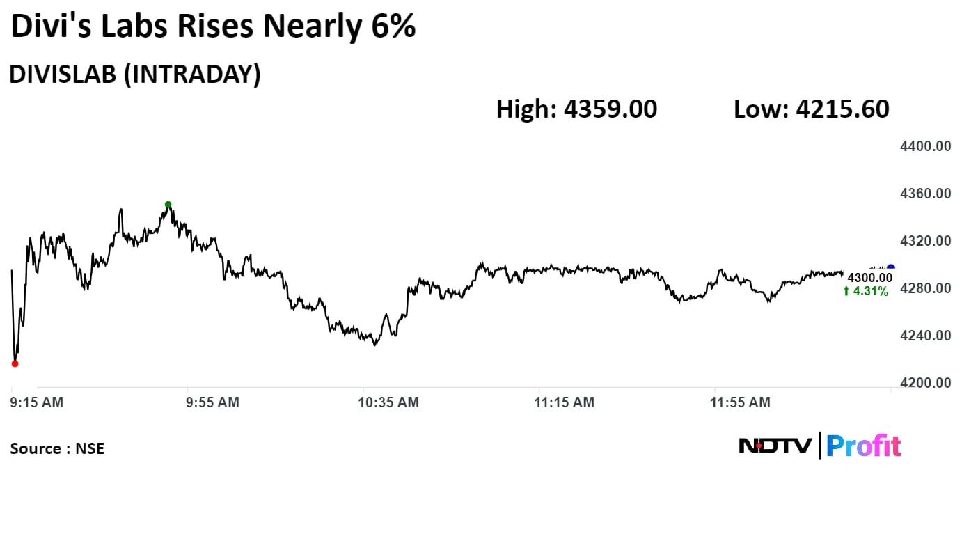 Shares of Divi's Laboratories Ltd. rose 5.74%, the highest level since May 23, before paring gains to trade 4.18% higher at 1:03 p.m. This compares to a 0.49% advance in the Nifty 50.