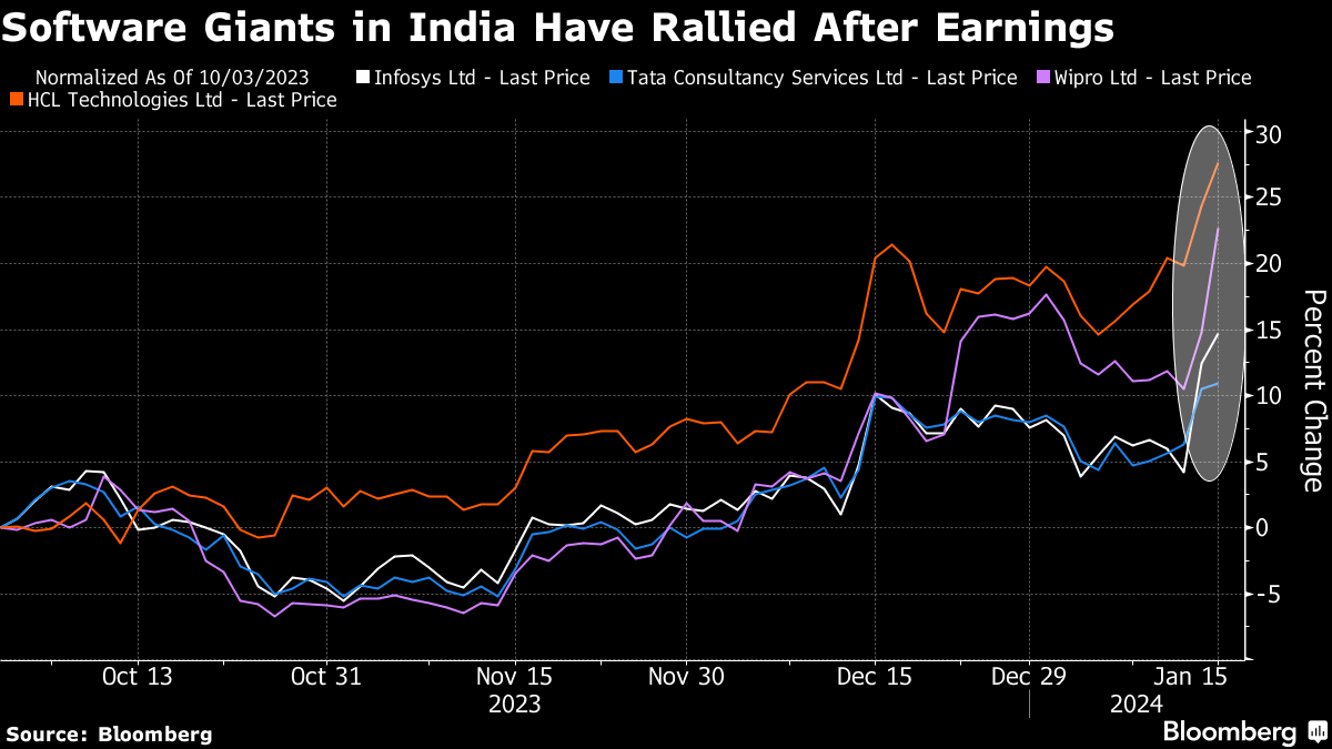Led by industry bellwether Tata Consultancy Services Ltd. and Infosys Ltd., the four key software companies, have added about $22 billion in market value in just two trading sessions since Thursday, when the earnings season kicked off. A potential revenue rebound and easing global macroeconomic worries have boosted sentiment.