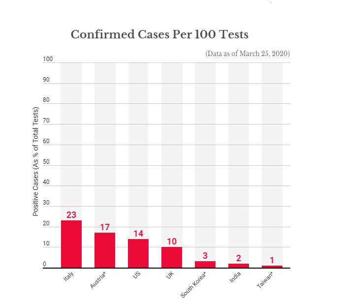 About one in every 50 tests conducted for Covid-19 in India as of March 25, 2020, have returned positive. In comparison, about a quarter of all tests in Italy, about a sixth in Austria and a tenth in the U.K. were positive, our analysis of data shows.
