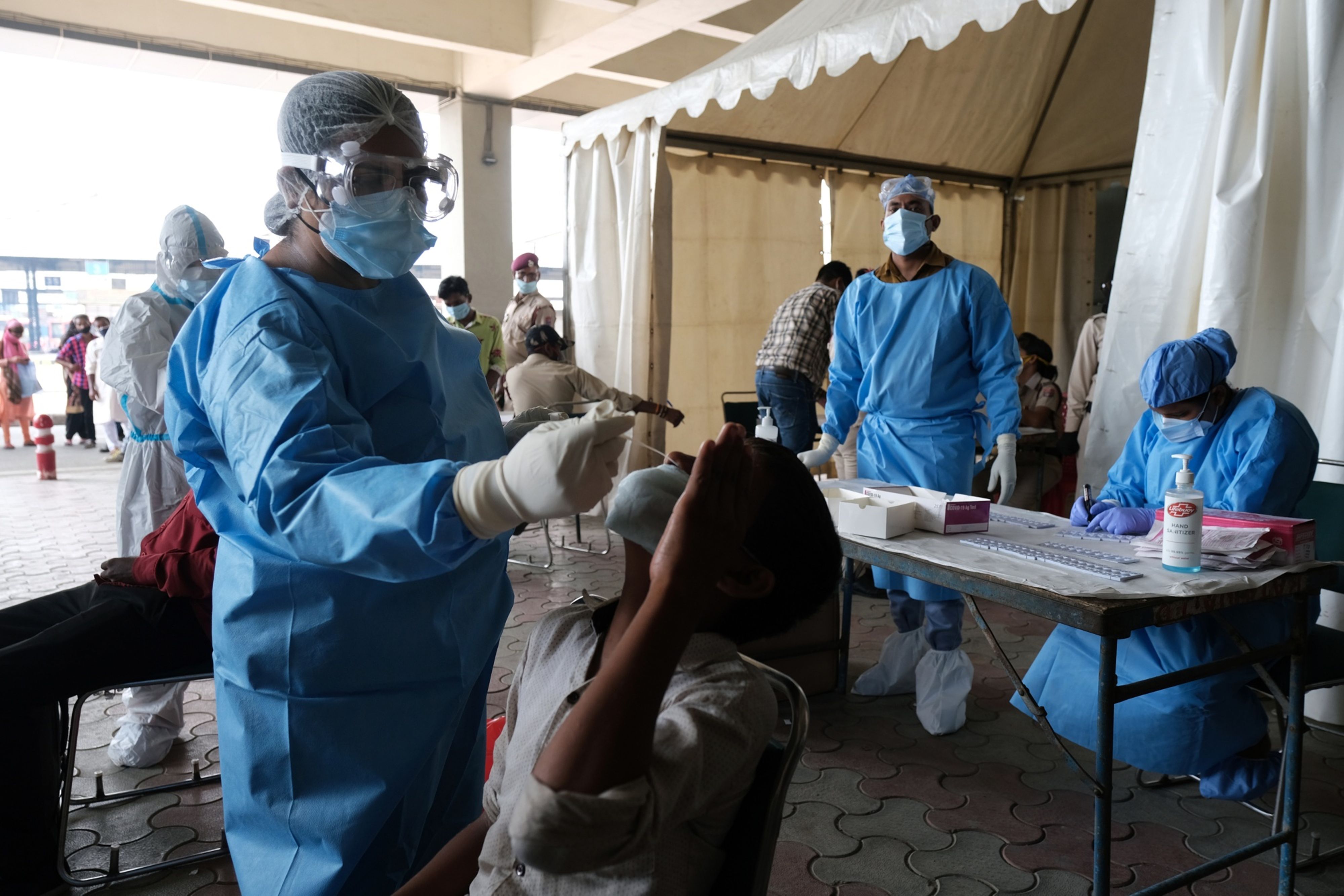 A healthcare worker dressed in personal protective equipment collects a swab sample for Covid-19 rapid antigen test in New Delhi. (Photographer: T. Narayan/Bloomberg)